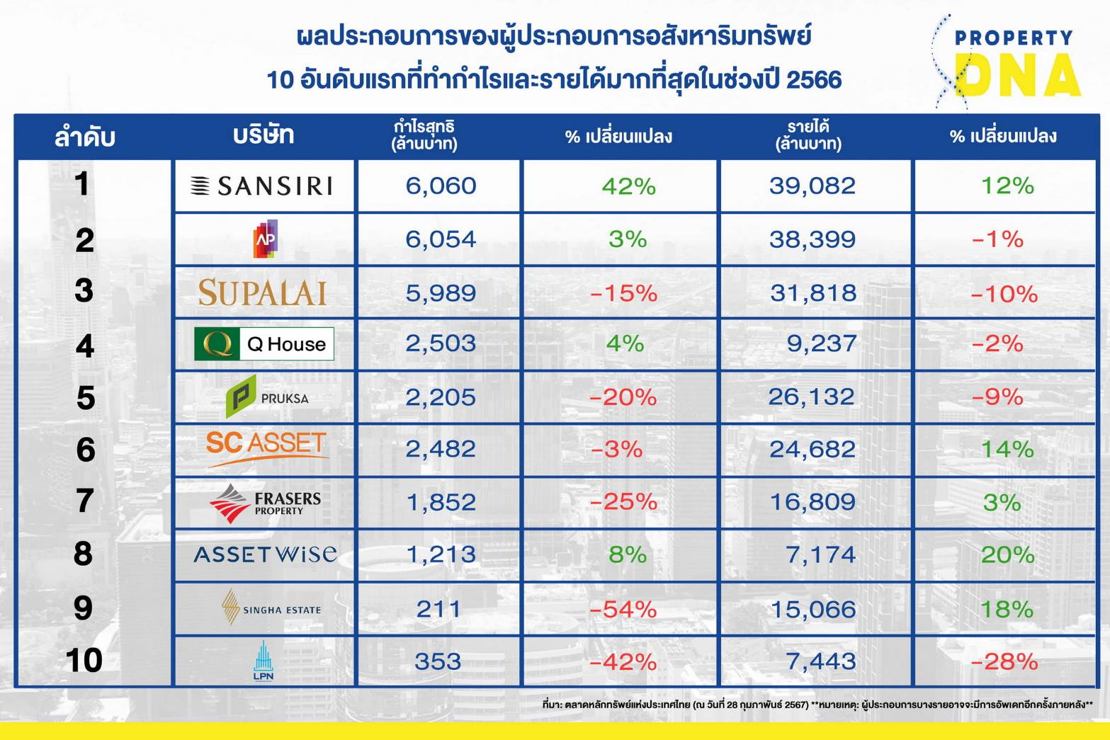 แสนสิริเป็นผู้ประกอบการที่มีกำไรในปีพ.ศ.2566 มากที่สุด โดยมีกำไรที่ 6060 ล้านบาทเพิ่มขึ้นประมาณ 42% เมื่อเทียบกับปีพ.ศ.2565 รายได้ของแสนสิริอยู่ที่ 39082 ล้านบาทเพิ่มขั้นประมาณ 12% จากปีที่แล้ว เอพี (ไทยแลนด์) มีรายได้และกำไรเป็นอันดับที่ 2 คือ มีรายได้ 38399 ล้านบาท ลดลงจากปีพ.ศ.2565 ประมาณ 1% กำไรที่ 6054 ล้านบาทเพิ่มขึ้นประมาณ 3% ซึ่งทั้งแสนสิริ และเอพีในปีที่ผ่านมา นอกจากจะเปิดขายโครงการใหม่มากแล้ว ยังมีการโอนกรรมสิทธิ์ทั้งบ้าน และคอนโดมิเนียมต่อเนื่อง รวมไปถึงการเร่งปิดการขายโครงการที่สร้างเสร็จแล้ว พร้อมโอนกรรมสิทธิ์ นอกจากนี้โครงการราคาแพงของทั้ง 2 บริษัทยังได้รับการตอบรับที่ดีโดยเฉพาะแสนสิริที่หลายโครงการของพวกเขาปิดการขายได้ภายในระยะเวลาไม่นาน แม้ว่าราคาขายเริ่มต้นจะไม่ต่ำกว่า 20 ล้านบาทก็ตาม