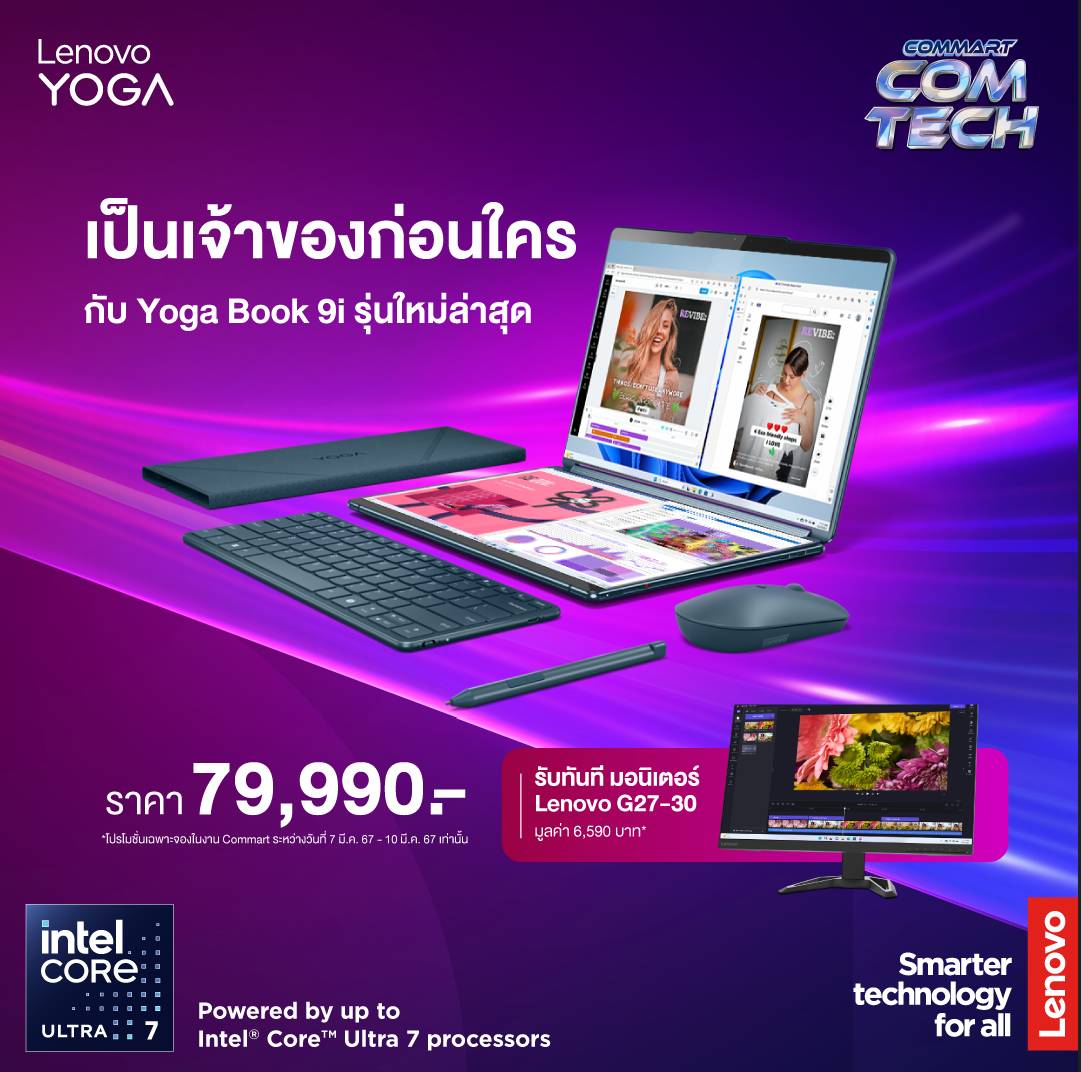 พบกับโปรโมชันพิเศษเฉพาะภายในงาน ‘Commart Com Tech 2024’ ระหว่างวันที่ 7 – 10 มีนาคม พ.ศ. 2567 เมื่อซื้อ Lenovo Yoga Book 9i รุ่นใหม่ล่าสุด รุ่น 83FF001TTA ราคา 79990 บาท รับทันที จอ Monitor รุ่น G27-30 มูลค่า 6590 บาท ติดตามข้อมูลเพิ่มเติมได้ที่เว็บไซต์ www.lenovo.com/th หรือ เฟสบุ๊คเพจ https://www.facebook.com/LenovoTH
