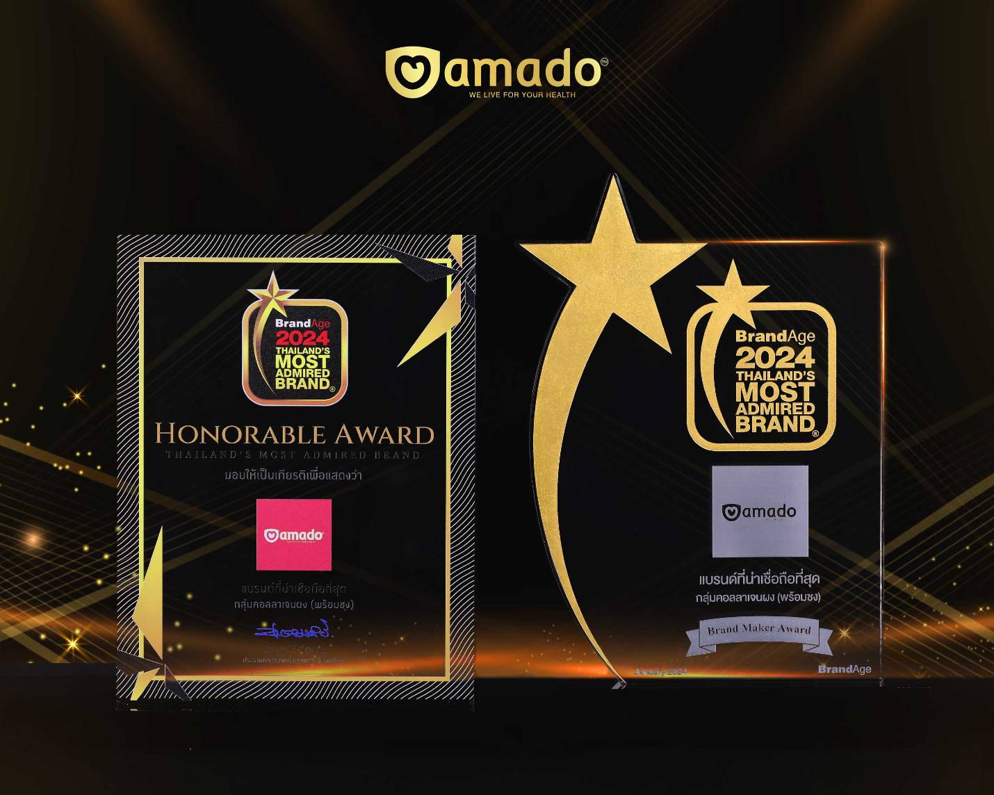ผลิตภัณฑ์เสริมอาหารคอลลาเจน จาก “อมาโด้” เป็นผลิตภัณฑ์คอลลาผง (พร้อมชง) ที่ได้รับคะแนนโหวตสูงสุดเป็นอันดับ 1 ได้รับรางวัล 2024 Thailand’s Most Admired Brand ในหมวดสินค้าบริโภค จากผลการสำรวจความน่าเชื่อถือและได้รับความไว้วางใจจากผู้บริโภค ซึ่งในปีนี้ ผลการสำรวจเป็นผลิตภัณฑ์คอลลาเจนที่ผู้บริโภคเชื่อถือที่สุดร้อยละ 24.30 จากผลิตภัณฑ์คอลลาเจนผง (พร้อมชง) ในประเทศไทย สะท้อนให้เห็นถึงความสำเร็จในด้านคุณภาพ และการพัฒนาผลิตภัณฑ์ ซึ่งเป็นหัวใจหลักในการดำเนินธุรกิจขององค์กร