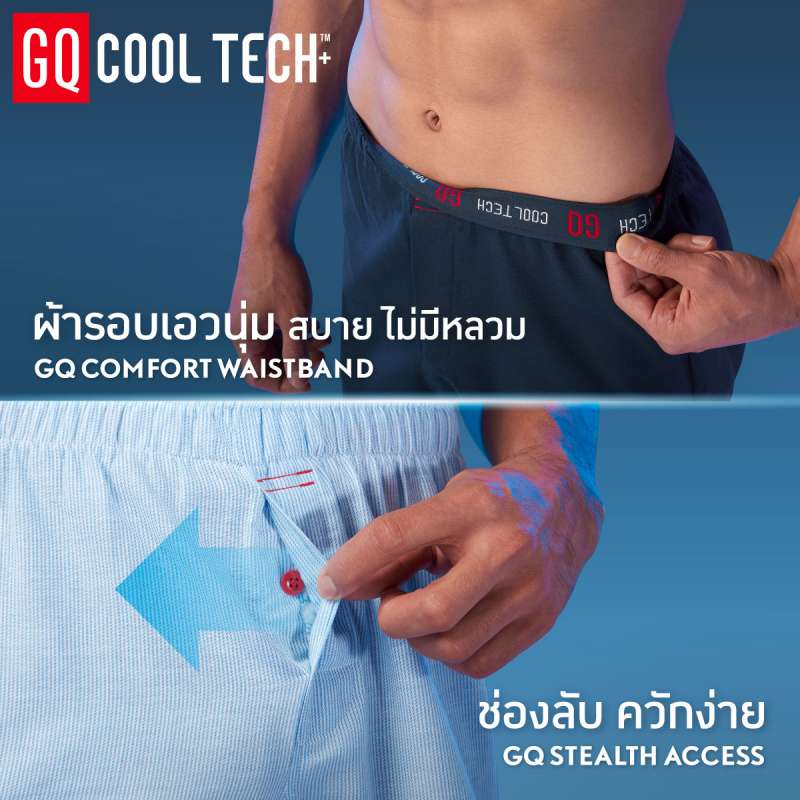 สำหรับ GQ Cool Tech™ Freeflow Boxer (บ๊อกเซอร์เย็นรอบด้าน) จะมาพร้อมกับผ้าคอตตอนที่ผสานเจลเย็น Cool Tech™ ทั้งตัว ช่วยมอบความสบายในการสวมใส่ พร้อมลดอุณหภูมิให้เย็นลงสูงสุด 2 องศา เอวด้านในมาพร้อมกับ GQ Comfort Waistband ผ้าทอหนานุ่มที่คอยป้องกันเอวของคุณไม่ให้เกิดรอยระหว่างสวมใส่ GQ Stealth Access ช่องลับด้านหน้าสำหรับกิจกรรมส่วนตัว ให้คุณได้เข้าห้องน้ำได้อย่างสะดวกเพียงแค่ปลดกระดุม พร้อมปกปิดอวัยวะสำคัญระหว่างสวมใส่ โดยจะมีให้เลือกทั้งหมด 4 สี (Blue Black Checked Dark Blue Gray)