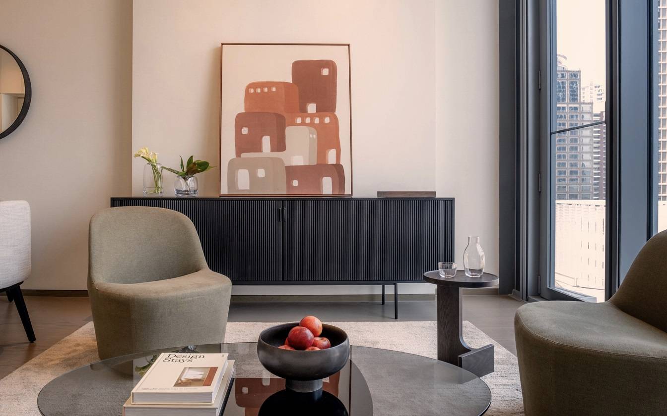 ตกแต่งภายใต้แนวคิด "Serene Aesthetic" รังสรรค์ความงดงามที่เงียบสงบด้วยเฟอร์นิเจอร์จากฝีไม้ลายมือดีไซเนอร์ระดับโลก ไม่ว่าจะเป็น AIva Alto Jonas Wagell หรือ Hvidt & Mølgaard มอบความรู้สึกเรียบง่าย สบายตา ไม่ซับซ้อนทว่าแฝงไปด้วยเรื่องราวและรายละเอียดพิถีพิถันที่รู้สึกได้ทันทีเมื่อได้สัมผัส เฟอร์นิเจอร์เป็นรูปแบบ Organic Shape ที่ตอบโจทย์ทั้งการใช้งานและความสวยงาม สะท้อนให้เห็นถึงความลงตัวในการผสมผสานวัสดุธรรมชาติ เช่น ไม้ หินและเส้นใยที่นุ่มนวลเข้าด้วยกัน เพื่อให้ผู้อยู่อาศัยสัมผัสถึงความนุ่มนวล สงบ สบายใจในทุกส่วนของห้อง นอกจากนี้ยังบ่งบอกถึงรสนิยมของผู้ครอบครองได้เป็นอย่างดี