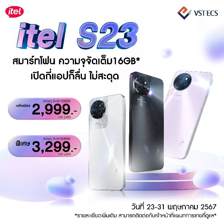 คุณสมศักดิ์ เพ็ชรทวีพรเดช ประธานเจ้าหน้าที่บริหาร บริษัท วีเอสที อีซีเอส (ประเทศไทย) จำกัด กล่าวว่า “ไอเทล (itel) คือสมาร์ทโฟนคุณภาพที่เราได้คัดสรร เข้ามาจัดจำหน่ายในประเทศไทย ที่ได้รับการตอบรับที่ดีจากผู้ใช้งาน รวมไปถึงพาร์ทเนอร์ทั่วประเทศกว่า 5500 ร้านค้า ล่าสุดจัดโปรโมชันกระตุ้นยอดขาย สมาร์ทโฟน itel รุ่น S23 วางจำหน่ายทั้งหมด 2 ความจุ ได้แก่ 128/8 8GB ลดเหลือราคา 2999 บาท จากปกติ 3499 บาท และ 256/8 8GB ลดเหลือราคา 3299 บาท จากปกติ 3899 บาท