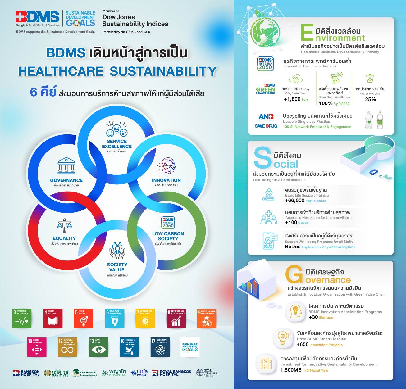 ในครึ่งปีแรก BDMS ได้พัฒนาธุรกิจสู่ความยั่งยืนอย่างต่อเนื่อง และครอบคลุมทุกด้าน ทั้ง มิติสิ่งแวดล้อม (Environment) ที่ดำเนินธุรกิจทางการแพทย์คาร์บอนต่ำอย่างเป็นมิตรต่อสิ่งแวดล้อมมากขึ้น รวมถึงการบริหารจัดการด้านสิ่งแวดล้อม BDMS Green Healthcare ส่วนมิติสังคม (Social) ได้มีการส่งมอบความเป็นอยู่ที่ดีให้แก่ผู้มีส่วนได้เสียในสังคม ได้แก่ การจัดอบรมกู้ชีพขั้นพื้นฐาน (CPR) เพื่อลดความเหลื่อมล้ำ สร้างความเท่าเทียมในการเข้าถึงการรักษา และมิติเศรษฐกิจ (Governance) ที่มุ่งสร้างนวัตกรรมทางการแพทย์ (BDMS Innovative Healthcare) ผ่านโครงการอบรมเทคนิคนวัตกรรมการผ่าตัดเปลี่ยนข้อสะโพก ด้วยเทคนิคใหม่ที่ไม่ตัดกล้ามเนื้อ และการบริการแพทย์ทางไกล เพื่อสุขภาพใจ (BeDee Tele Mental Health) โดยร่วมกับ มูลนิธิเวชดุสิต ฯ ขยายโอกาสในการดูแลสุขภาพ