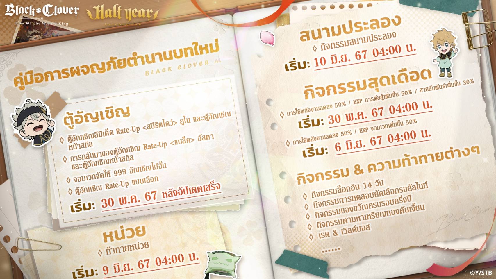 เริ่มต้นการผจญภัยที่น่าจดจำกับ Black Clover M ฉลองครบรอบครึ่งปี เข้าร่วมกิจกรรมการทดสอบคัดเลือกรอยัลไนท์ กิจกรรมของขวัญครบรอบครึ่งปี และกิจกรรมล็อกอิน เพื่อทำภารกิจสุดท้าทายและรับสิทธิ์อัญเชิญสูงสุดถึง 100 ครั้ง และปลดล็อกรางวัลฟรีอีกมากมาย ทั้งยังมีตู้อัญเชิญจอมเวทจัดให้ อัญเชิญฟรี 999 ครั้งและตู้อัญเชิญแบบเลือก ที่ให้ผู้เล่นสามารถอัญเชิญตัวละครที่ชื่นชอบ เช่น ฟานา เธิร์ดอาย: ความเกลียดชัง และ ราชินีแม่มด ป่าแม่มด เป็นต้น ให้การอัญเชิญทุกครั้งเป็นส่วนหนึ่งของการเดินทางที่ยิ่งใหญ่ในโลกของ Black Clover M