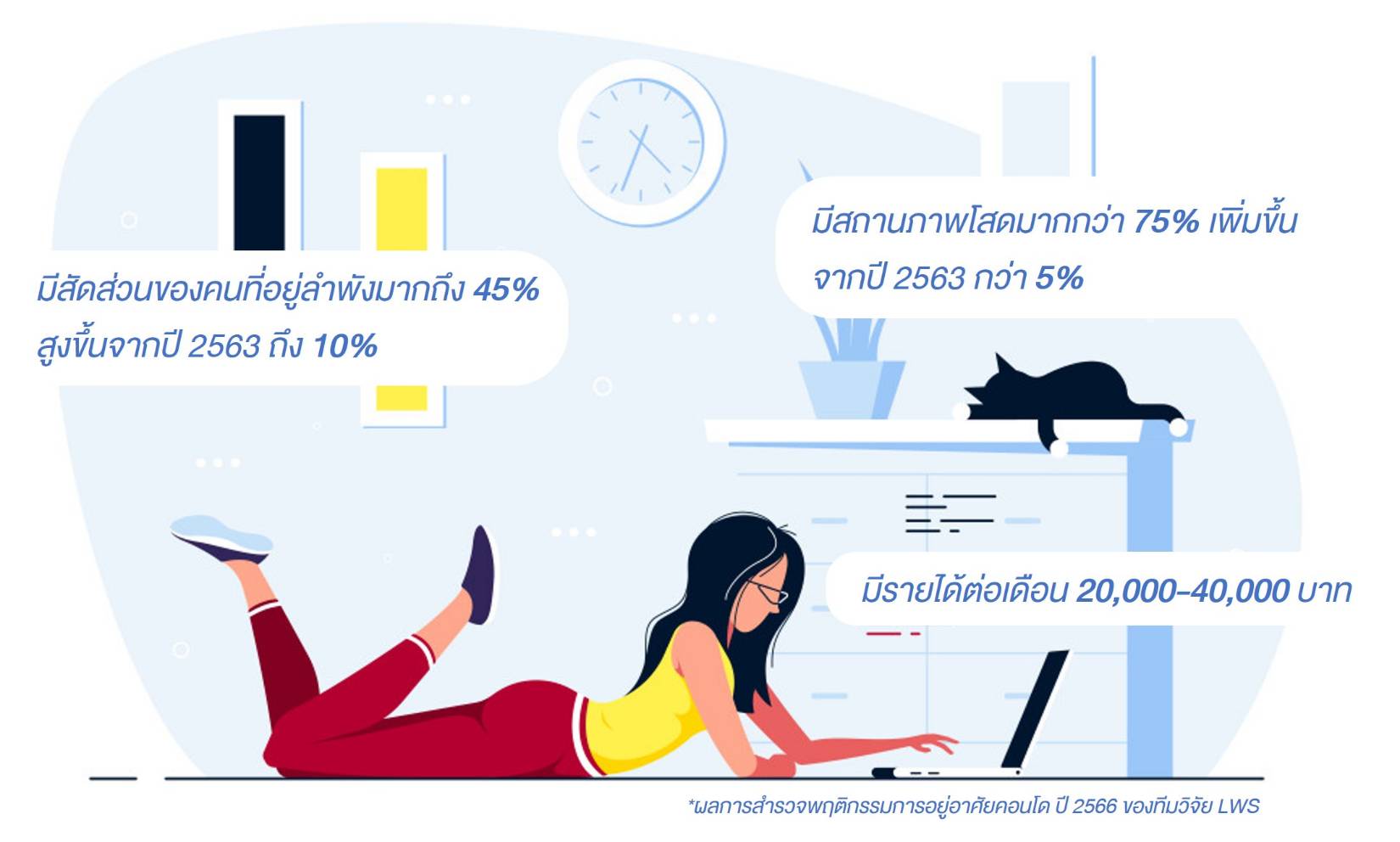 ในขณะที่ ผลสำรวจของ แอล. ดับเบิลยู. เอส.ฯ เมื่อเดือน พฤษภาคม ปี 2566 จากจำนวนผู้อยู่อาศัยใน โครงการอาคารชุดในพื้นที่กรุงเทพฯ-ปริมณฑล 729 ตัวอย่าง พบว่า มีสัดส่วนของคนที่อยู่เพียงลำพัง คิดเป็นสัดส่วน 45% สูงขึ้นจากปี 2563 ถึง 10% และ มีสถานภาพโสดมากกว่า 75% เพิ่มขึ้นจากปี 2563 ประมาณ 5% โดยมีรายได้ต่อเดือนอยู่ในช่วง 20000-40000 บาท