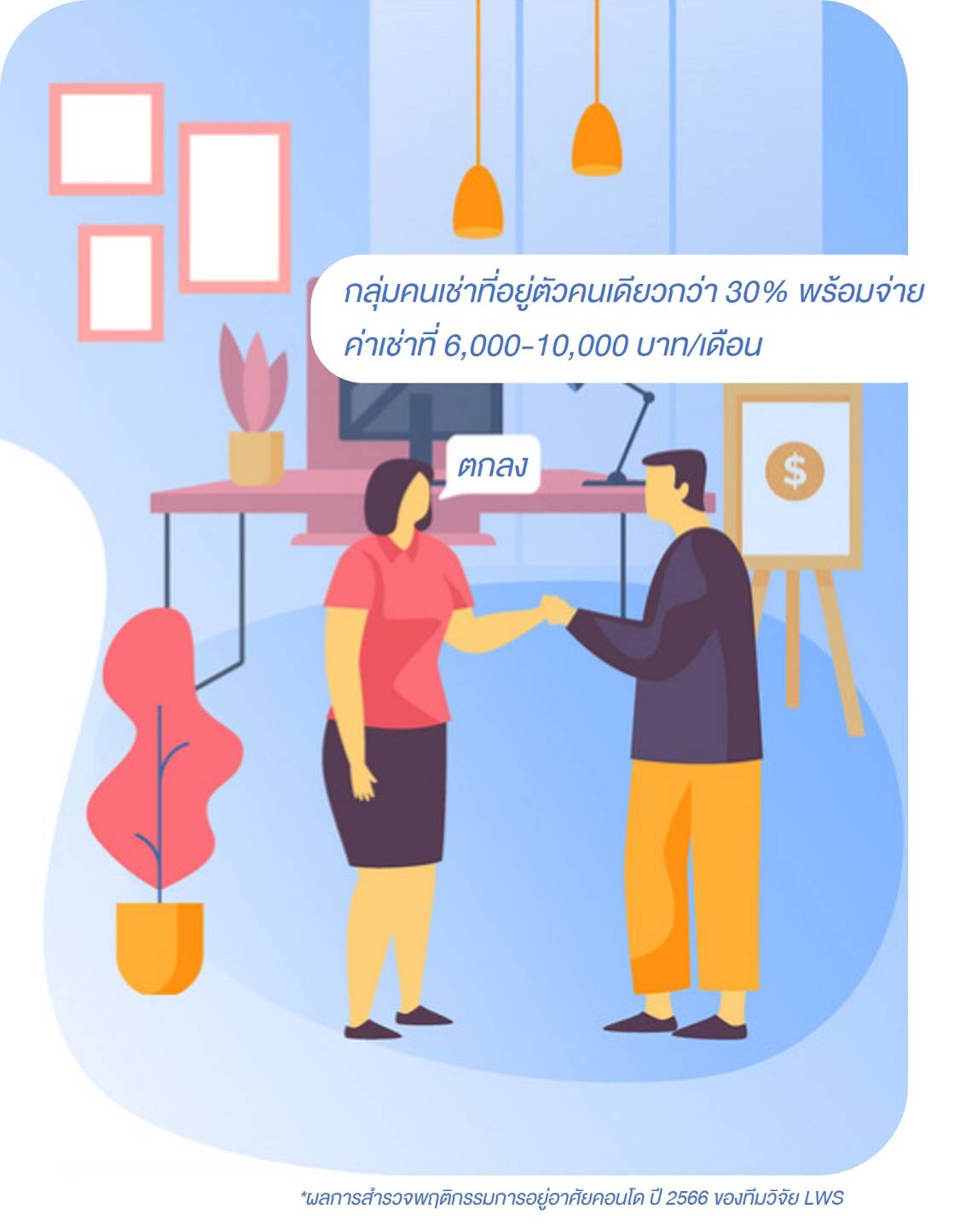 จากการสำรวจพฤติกรรมการอยู่อาศัยในอาคารชุดพักอาศัย ของ แอล. ดับเบิลยู. เอส.ฯ ในปี 2566 พบว่า กลุ่มคนเช่าที่อยู่ตัวคนเดียวกว่า 30% มีความศักยภาพที่พร้อมจ่ายค่าเช่าตั้งแต่ 6000-10000 บาท/เดือน