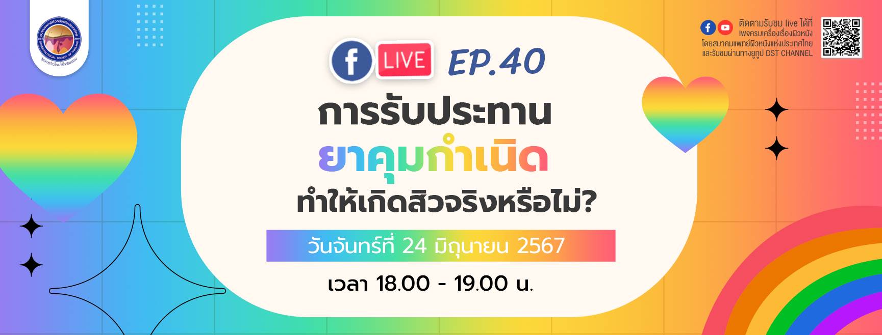 สมาคมแพทย์ผิวหนังฯ เชิญรับชมเพจเฟซบุ๊ก ’’ครบเครื่องเรื่องผิวหนัง’’ EP.40 ตอน ’’การรับประทานยาคุมกำเนิด ทำให้เกิดสิวจริงหรือไม่’’