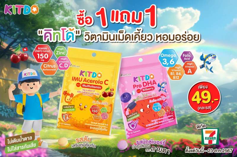 “คิทโด้” วิตามินเม็ดเคี้ยว 2 สูตร 2 รสชาติ มากคุณค่าสารอาหาร จัดโปร 1 แถม 1 ช่วยเสริมภูมิคุ้มกัน ป้องกันหวัด บำรุงสมองและสายตา ซื้อได้ที่เซเว่น อีเลฟเว่น