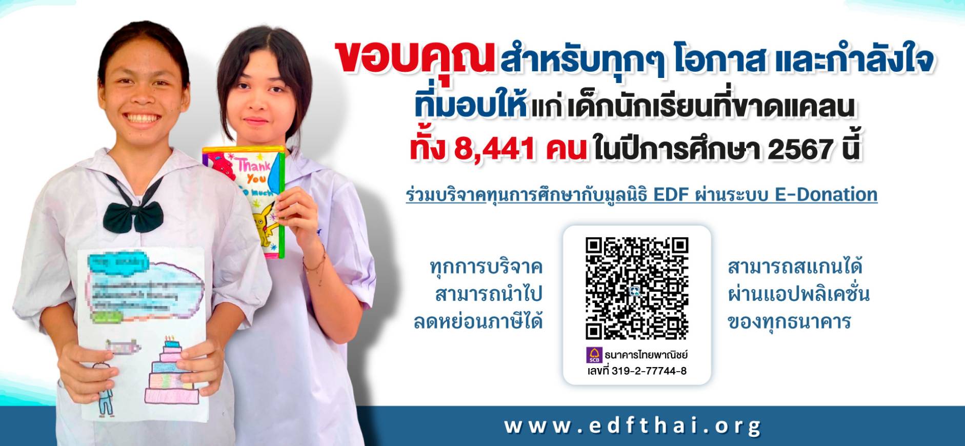 “ในนามของคณะกรรมการบริหารและเจ้าหน้าที่มูลนิธิ EDF ผมขอขอบคุณองค์กรต่าง ๆ และผู้บริจาครายบุคคลที่มีส่วนร่วมส่งเสริมโอกาสทางการศึกษาให้นักเรียน นิสิต นักศึกษาที่ยากจน ช่วยให้เยาวชนเหล่านี้ได้มีสมาธิตั้งใจเรียนใฝ่หาความรู้เพื่ออนาคตที่สดใสของตนเองได้อย่างแท้จริง ด้วยความมุ่งมั่นในการมีส่วนร่วมพัฒนาคุณภาพชีวิตของเยาวชนที่ยากไร้ให้มีโอกาสได้เข้าถึงระบบการศึกษา พวกเราภูมิใจอย่างยิ่งที่ได้มีส่วนช่วยต่อลมหายใจให้เยาวชนเหล่านี้ได้มีพื้นที่ยืนอยู่ในระบบการศึกษาได้ต่อไปอย่างน้อย 1-3 ปี หรือจนกว่าพวกเขาจะสำเร็จการศึกษา และพร้อมกันนี้ตั้งแต่ 1 กรกฏาคม 2567 ที่ผ่านมา มูลนิธิได้เปิดรับบริจาคทุนการศึกษาล่วงหน้าปีการศึกษา 2568 เพื่อเพิ่มโอกาสให้เยาวชนไทยที่ด้อยโอกาสได้มีโอกาสเข้าถึงการศึกษาให้มากที่สุด คาดการณ์ว่าจะมีเยาวชนที่ยากจนจากสถาบัน การศึกษาต่าง ๆ ทั่วประเทศสมัครขอรับทุนการศึกษาผ่านสถาบันการศึกษาของตนเองไม่น้อยกว่า 10000 คน ทั้งนี้ปัญหาเศรษฐกิจยังคงเป็นอุปสรรคสำคัญต่อการเข้าถึงการศึกษาของเยาวชนที่ครอบครัวมีฐานะยากจน แม้ว่าจะได้รับการสนับสนุนค่าใช้จ่ายบางส่วนจากภาครัฐก็ตามแต่ก็ยังไม่เพียงพอ มีค่าใช้จ่ายหลายอย่างที่การสนับสนุนยังไม่ครอบคลุม เช่น ค่าเดินทางไป-กลับสถานศึกษา ค่าอาหารกลางวันสำหรับนักเรียนระดับมัธยมศึกษา และค่าใช้จ่ายอื่นๆ ที่เกี่ยวข้องกับการศึกษา เป็นต้น”