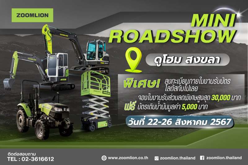 Zoomlion ขนทัพสินค้ามากมายและเปิดตัวรถขุดไฮดรอลิกรุ่นใหม่ในงานมินิโรดโชว์ต่างๆ ลุยพบปะลูกค้าในท้องถิ่นให้สัมผัสเครื่องจักรตัวจริงใกล้บ้าน ล่าสุดเอาใจชาว กบินทร์บุรี จ. ปราจีนบุรี และได้รับความสนใจจากลูกค้าเป็นจำนวนมาก ต่อมาซูมไลออน จึงขนทัพเครื่องจักรไปจัดงานแสดงสินค้าอย่างต่อเนื่องเอาใจชาว อ. ชะอำ จ. ประจวบคีรีขันธ์ อาทิ เครื่องจักรทั้งรถขุดไฮดรอลิก รถกระเช้า และรถแทรกเตอร์รุ่นใหม่ล่าสุดเพิ่งนำเข้าประเทศไทย พร้อมทีมงานให้คำปรึกษาและแนะนำ เมื่อ 31 กรกฎาคม – 4 สิงหาคม 2567 ที่ไทวัสดุ ชะอำ