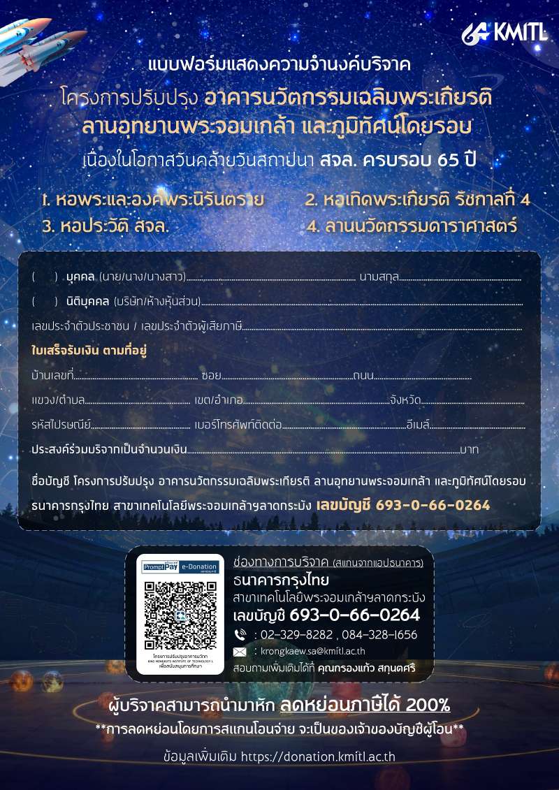 เนื่องในวโรกาสครบรอบ 65 ปี ทางสถาบันเทคโนโลยีพระจอมเกล้าเจ้าคุณทหารลาดกระบัง (สจล.)มีความสำนึกในพระมหากรุณาธิคุณของพระองค์อย่างล้นพ้น จึงได้มีความประสงค์ปรับปรุงอาคารนวัตกรรมเฉลิมพระเกียรติ ลานอุทยานพระจอมเกล้า และภูมิทัศน์โดยรอบเพื่อพัฒนา “อาคารหอพระราชประวัติพระบาทสมเด็จพระจอมเกล้าเจ้าอยู่หัว พระสยามเทวมหามกุฏวิทยมหาราช" ให้เป็นศูนย์กลางแห่งการเรียนรู้ การวิจัย และนวัตกรรมที่ทันสมัยตอบสนองต่อความต้องการของนักศึกษา บุคลากร และสังคม ตลอดจนเป็นการยกระดับภาพลักษณ์ของสถาบันให้เป็นที่ยอมรับในระดับนานาชาติ โดยปรับปรุงภูมิทัศน์ ประกอบด้วย 4 กิจกรรม ดังนี้
