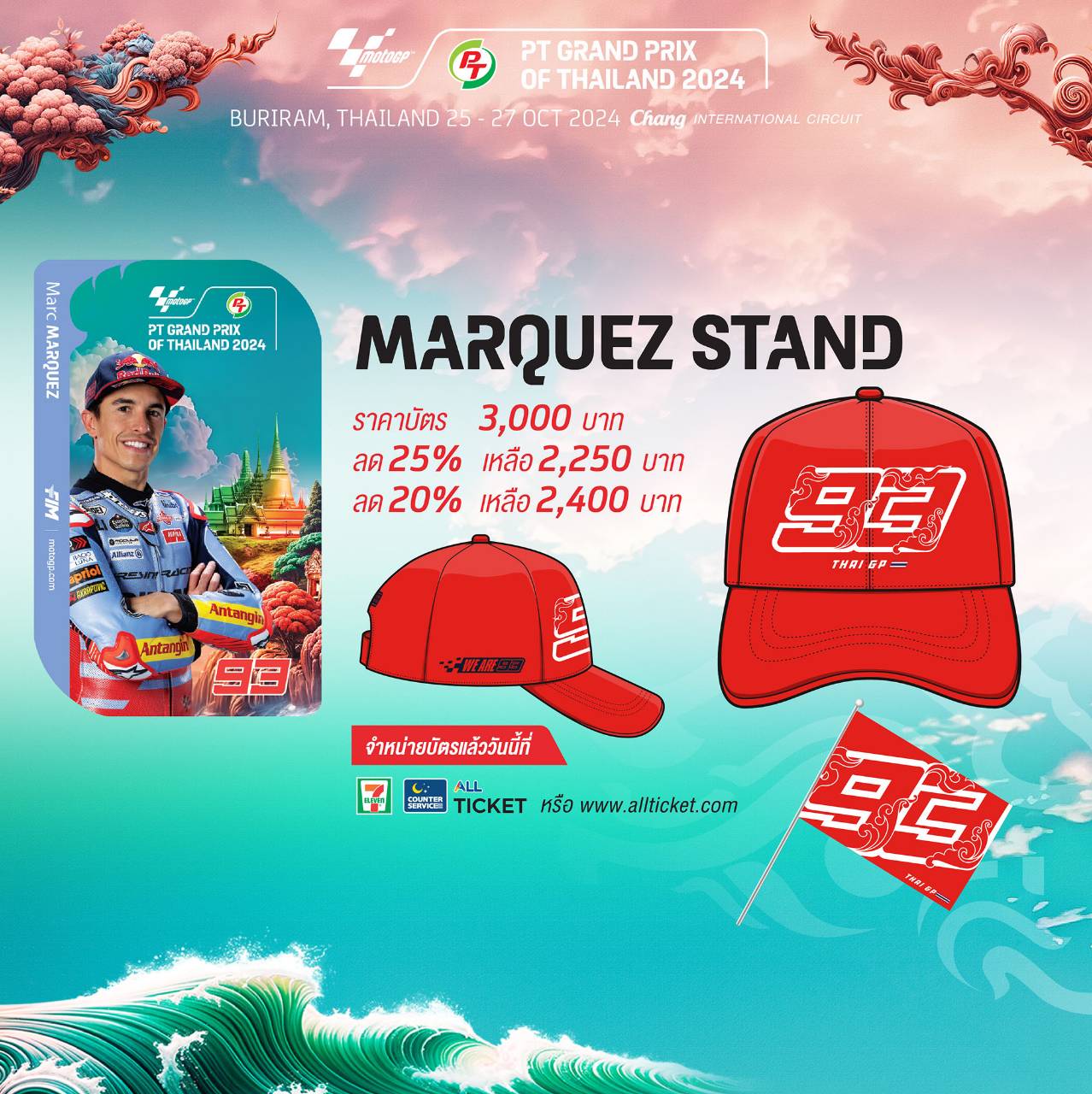 ฝ่ายจัดการแข่งขันโมโตจีพี สนามประเทศไทย นำโดย การกีฬาแห่งประเทศไทย เผยโฉมของที่ระลึกลิขสิทธิ์แท้ โดยเปิดตัวสแตนด์ “ก้อง” สมเกียรติ จันทรา จากฮอนด้า เป็นเสื้อ SC35 ลายเสือ ซึ่งเป็นปีเกิดนักบิดสายเลือดไทยที่จะลงแข่งขันในรุ่น Moto2 ก่อนขยับไปบิดในพรีเมียร์คลาสในปี 2025-2026 นอกจากนี้ยังมี “ฟาบิโอ กวาร์ตาราโร” ชูความเป็น Yamaha Factory Team ใช้สีน้ำเงินที่เป็นสัญลักษณ์ของค่ายยามาฮ่า ส่วนมาร์ค มาร์เกซ จากเกรซินี่ เรซซิ่ง ชูลวดลาย “กนก” ที่เป็นลายศิลปะที่พบเห็นและเป็นที่นิยมในสถาปัตยกรรมและงานศิลปะไทยแต่โบราณ แสนงดงามอ่อนช้อย มาผสานในการออกแบบของที่ระลึก อวดสายตาสู่ชาวโลก