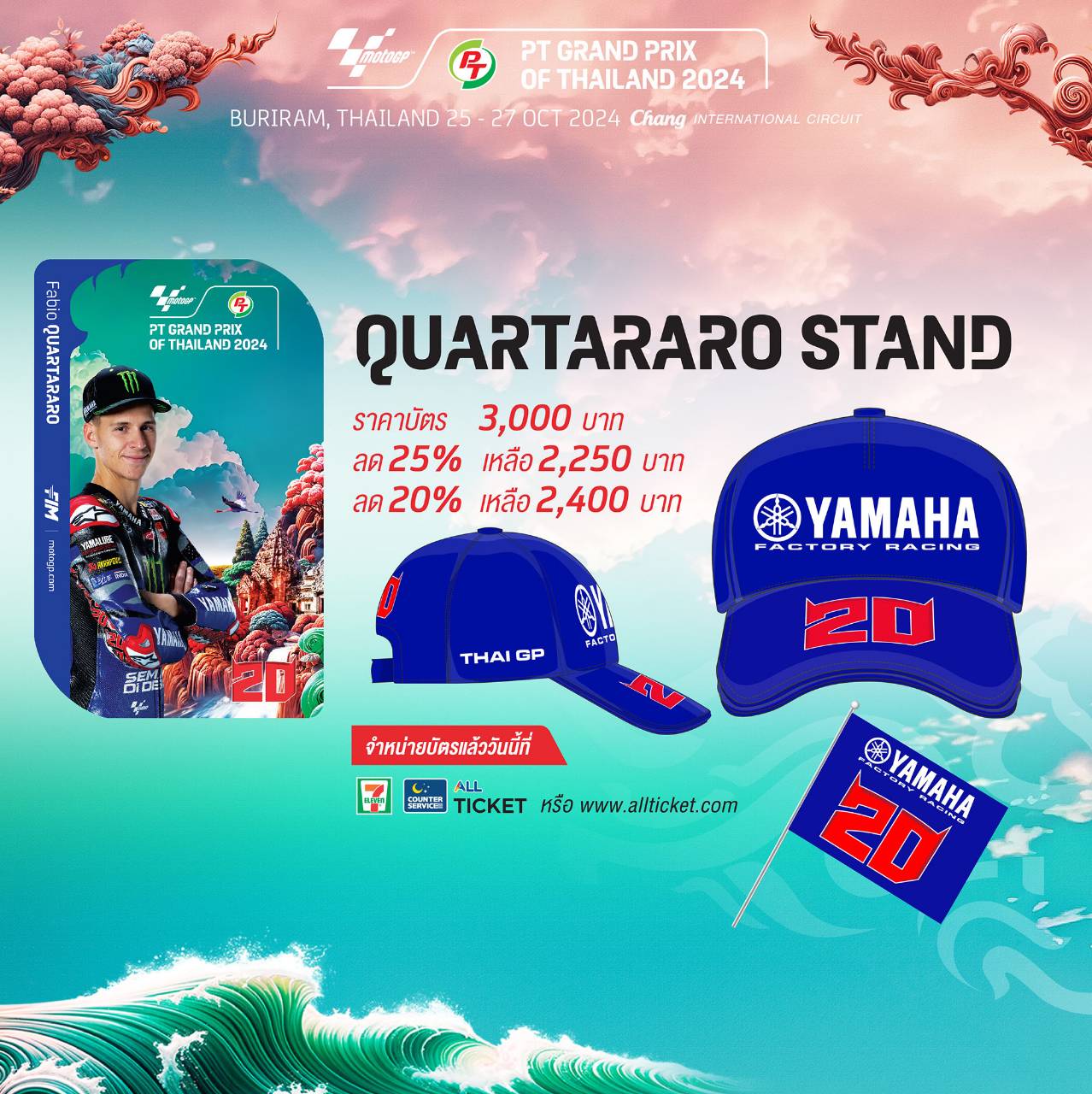 กวาร์ตาราโร สแตนด์ สำหรับ แฟนฟาบิโอ กวาร์ตาราโร จะเป็นหมวกและธง สีน้ำเงิน ด้วยหมายเลข 20 และข้อความเป็นสีขาว Yamaha Factory team สัญลักษณ์ของทีมยามาฮ่าทีมโรงงาน