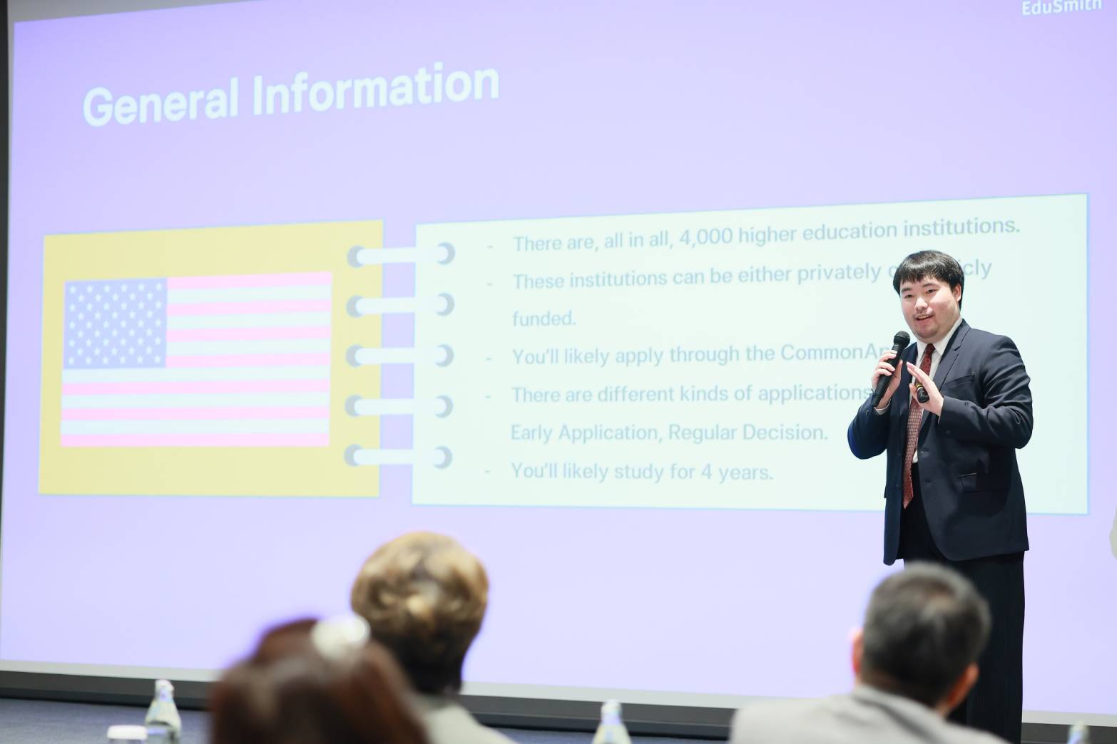 นายพีรกานต์ กาญจนพิมลกุล ที่ปรึกษาด้านกลยุทธ์การเตรียมใบสมัครจาก EduSmith กล่าวว่า สถาบันมีความเชี่ยวชาญในการวางแผนการศึกษาให้กับนักเรียนทั้งในระดับไฮสคูล ปริญญาตรี ปริญญาโท ปริญญาเอก และบอร์ดดิงสคูล พร้อมที่จะให้คำแนะนำกับลูกค้าที่สนใจส่งบุตรหลานไปศึกษาต่อต่างประเทศ ไม่ว่าจะเป็นสหรัฐอเมริกา ยุโรป อังกฤษ แคนาดา ฮ่องกง สิงคโปร์ และญี่ปุ่น เป็นต้น สำหรับน้อง ๆ ที่สอบติด TOP 50-70 มหาวิทยาลัยชื่อดังของสหรัฐฯ จาก 4000 แห่ง ซึ่งปัจจุบันร้อยละ 95 จะรับสมัครผ่าน Common App โดยเฉลี่ยการศึกษาต่อในมหาวิทยาลัยของสหรัฐฯ จะใช้ระยะเวลา 4 ปี ซึ่งในแต่ละปี โควตาการเปิดรับสมัครของมหาวิทยาลัยไม่ได้ลดลงแต่อย่างใด แต่จำนวนผู้สมัครนั้นเพิ่มขึ้นในทุกปี โดยประเทศที่ส่งใบสมัครมาสูงสุดเป็นอันดับต้น ๆ