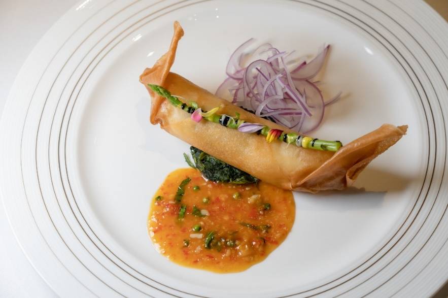 ปอเปี๊ยะปลาเก๋าแดงกับซอสพริกสดใบโหระพา