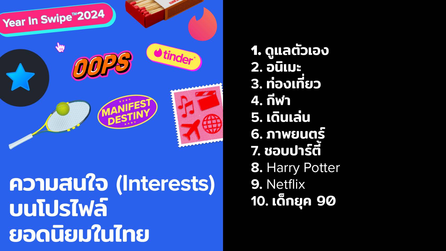 สำหรับคนโสดในไทย ยังเน้นเชื่อมต่อกันผ่านแพชชันความสนใจที่คล้ายกัน อ้างอิงจากรายงาน 2024 Year In Swipe™ ระบุว่า ความสนใจ (interests) ยอดนิยมของคนโสดไทย อาทิ ดูแลตัวเอง ท่องเที่ยว กีฬา นอกจากนั้น สไตล์การสื่อสารยอดนิยม ได้แก่ เจอหน้ากันดีกว่า คนชอบแชท และ คุยโทรศัพท์ และสไตล์การแสดงความรักยอดนิยมของคนนิวเจนคือ การกระทำที่เอาใจใส่ การใช้เวลาร่วมกัน และ การสัมผัส ส่วนกิจกรรมการออกเดทที่ได้รับความนิยมได้แก่ เล่น ROV หาเพื่อนคุย และ ดูหนัง เป็นต้น³