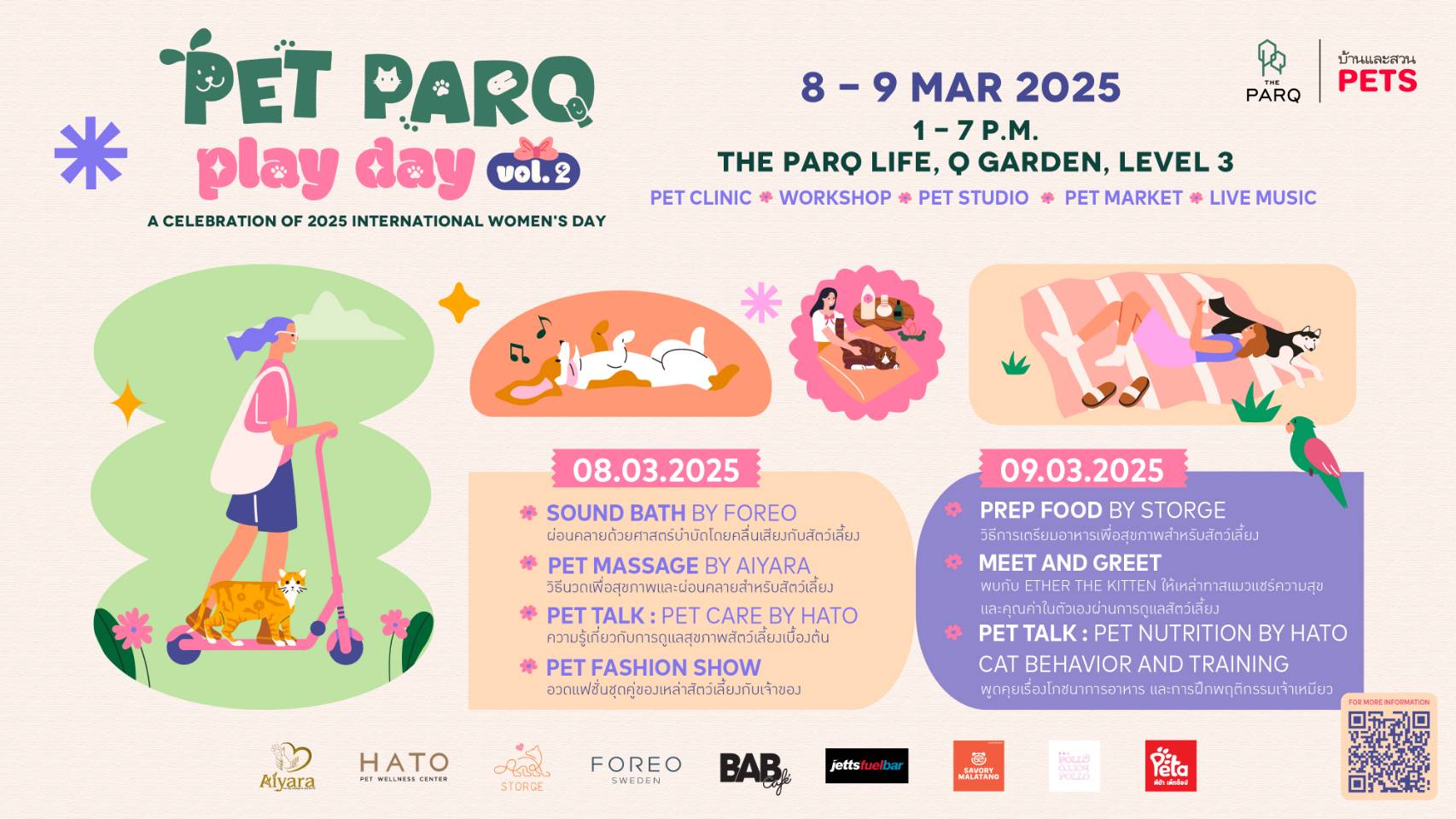กลับมาอีกครั้งกับบรรยากาศการฮีลใจของ PET PARQ PLAY DAY VOL.2 งานแห่งความสุขที่คนรักสัตว์และคนที่อยากเติมพลังใจไม่ควรพลาด! เดอะ ปาร์ค (The PARQ) ร่วมกับ บ้านและสวน PETS เชิญชวนทุกคนมาสัมผัสโมเมนต์ดี ๆ กับเพื่อนซี้สี่ขา ที่จะช่วยให้คุณและสัตว์เลี้ยงได้รีชาร์จพลัง ผ่อนคลายทั้งกายและใจ ฉลองวันสตรีสากลในบรรยากาศที่เต็มไปด้วยความรัก ความอบอุ่น และพลังงานดี ๆ ระหว่างวันที่ 8 – 9 มีนาคม 2568
