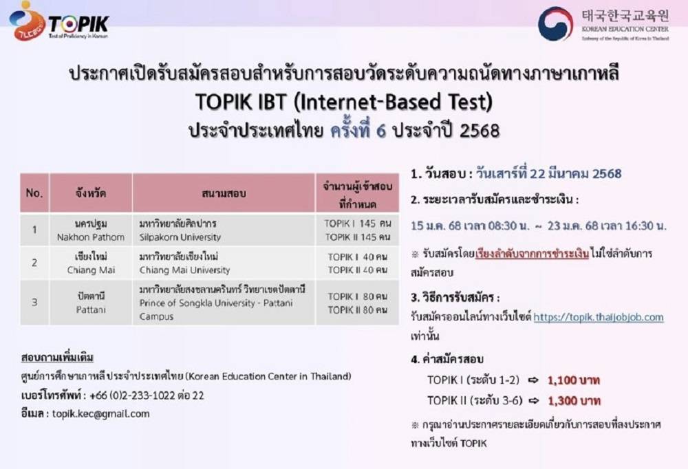 เมื่อวันที่ 22 มีนาคม 2568 ที่ผ่านมา ศูนย์การศึกษาเกาหลี ประจำประเทศไทย ได้เปิดการสมัครสอบ Topik1 (1100บาท/คน) และ Topik2 (1300 บาท/คน) โดยเป็นการสอบวัดระดับทางภาษาเกาหลี(Topik PBT) ประจำปี 2568 โดยมีจำนวนผู้เข้าสอบและสถานที่เข้าสอบ จำนวน 3 สนามสอบประกอบด้วย 1.มหาวิทยาลัยศิลปากร จังหวัดนครปฐม แบ่งเป็น Topik1 จำนวน 145 คน และ Topik2 จำนวน 145 คน 2.มหาวิทยาลัยเชียงใหม่ จังหวัดเชียงใหม่ แบ่งเป็น Topik1 จำนวน 40 คน และ Topik2 จำนวน 40 คน และ มหาวิทยาลัยสงขลานครินทร์ วิทยาเขตปัตตานี แบ่งเป็น Topik1 จำนวน 80 คน และ Topik2 จำนวน 80 คน โดยการชำระเงินค่าสมัครสอบชำระผ่านแอพลิเคชันธนาคารโดยระบบ Thai QR Payment เท่านั้น(ไม่สามารถชำระทางเคาน์เตอร์ธนาคารหรือบัตรเครดิตได้) โดยในส่วนของเว็บไซต์ https://topik.thaijobjob.com/ แจ้งว่า หากมีข้อสงสัย หรือมีต้องการติดต่อสอบถามโดยตรงได้ที่เบอร์ 02-257-7159(ต่อ 3) หรือ 02-233-1022 (ต่อ22)