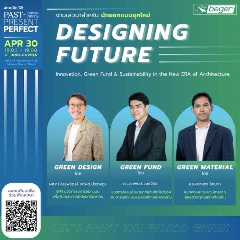 เบเยอร์ เปลี่ยนใหญ่ ไม่ธรรมดาแน่นอนปีนี้ มากับดีไซน์สุดล้ำ กับ Designing Future แนวคิดที่รวมพลังของ นวัตกรรม เทคโนโลยี และความยั่งยืน เพื่อสร้างอนาคตแห่งการออกแบบที่ทั้งทรงพลังและรับผิดชอบต่อสิ่งแวดล้อม สอดรับกับธีมหลักของงาน “ทบทวน ทิศทาง: Past Present Perfect” ที่ชวนมองย้อนอดีต เข้าใจปัจจุบันและออกแบบอนาคตอย่างมีเป้าหมายพบกับ Interactive Booth สุดล้ำ ที่จะเปลี่ยนการเรียนรู้เรื่องนวัตกรรมให้กลายเป็นประสบการณ์ที่“สนุก-เข้าใจง่าย-ได้แรงบันดาลใจ”พร้อมกิจกรรมพิเศษมากมาย ที่ทั้ง สายออกแบบ สายก่อสร้าง และสายรักษ์โลก ต้องห้ามพลาด! พร้อมเปิดตัวเฉดสี Green Palette ครั้งแรกในไทย! กลุ่มโทนสีคาร์บอนต่ำที่ถูกบรรจุใน BIM มุ่งเน้นการลดค่าปลดปล่อยคาร์บอน ทั้ง Embodied และ Operational Carbon อย่างเป็นรูปธรรม เปิดให้สถาปนิกและนักออกแบบได้ใช้งานจริงแล้ววันนี้
