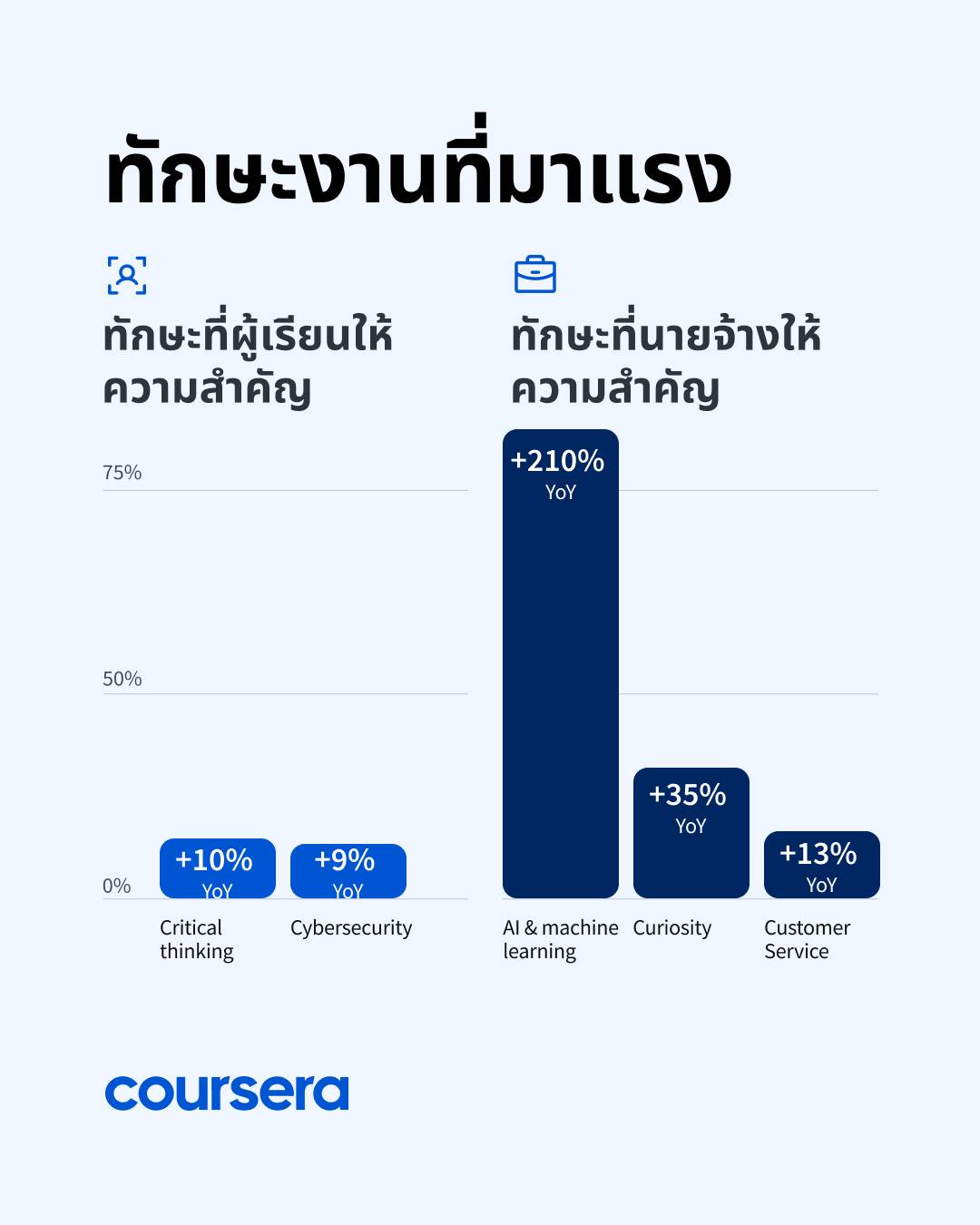 แนวโน้มการเรียนรู้ทักษะด้าน AI มีลักษณะหลายอย่างในระดับประเทศที่แนะนำนโยบาย ’ อว . สำหรับ AI’ ของกระทรวงอุดมศึกษาแผนการวิจัยและการวิจัย 4.0 รวมไปถึงการวิจัยด้านเทคโนโลยีใหม่ๆ ที่เป็นแนวทางขึ้นเพื่อคนไทยสู่ตลาดแรงงานในทิศทางต่างๆ AI ของอย่าง เต็มรูปแบบใน รายงาน World Economic Forum ’s Future of Jobs Report 2025 วิจัยไทยกำลังตรวจสอบการเปลี่ยนแปลงด้านดิจิทัลโดยมากกว่า 89% ได้ใช้ AI แล้วและอีก 93% โครงการ ว่า AI และ นวัตกรรมประเทศไทยการภายในปี 2573 ข้อมูลผู้เรียนจาก Coursera เองก็ชี้ให้เห็นถึงความสำคัญอย่างยิ่งโดยจำนวนผู้ลงทะเบียนเรียนเป็นพิเศษถึง 43% จากปีที่แล้วและทักษะที่นายจ้างมีอัตราผู้ลงทะเบียนเรียนเพิ่ม ขึ้น อย่างมีนัยยะสำคัญ โดยทักษะ AI และ Machine Learning ส่วนใหญ่ 210% ทักษะ Curiosity ในช่วง 35% ทักษะ Customer Service ปกติ 13% และทักษะ Creative Thinking 12%
