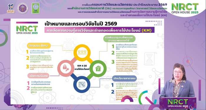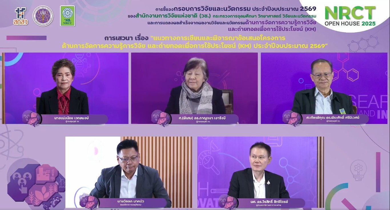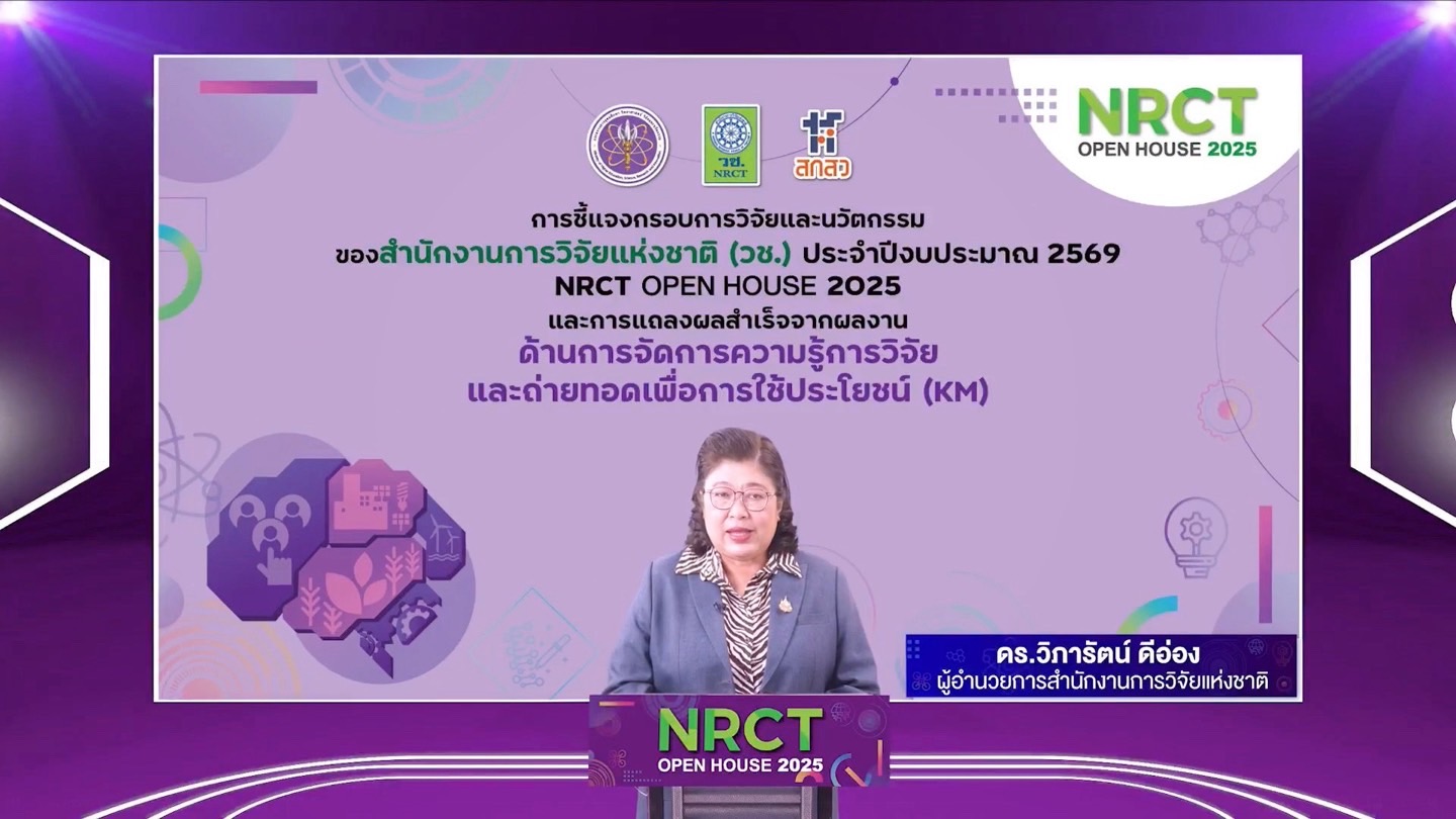วันที่ 28 มิถุนายน พ.ศ. 2568 สำนักงานการวิจัยแห่งชาติ(วช.) กระทรวงการอุดมศึกษา วิทยาศาสตร์ วิจัยและนวัตกรรม จัดกิจกรรมเปิดบ้านชี้แจงกรอบการวิจัยและนวัตกรรม ประจำปีงบประมาณ 2569 (NRCT Open House 2025) และการแถลงผลสำเร็จจากผลงานวิจัยและนวัตกรรม “ด้านการจัดการความรู้การวิจัยและถ่ายทอดเพื่อการใช้ประโยชน์ (KM)” โดยมี ดร.วิภารัตน์ ดีอ่อง ผู้อำนวยการสำนักงานการวิจัยแห่งชาติ เป็นประธานเปิดงาน โดยมีผู้เข้าร่วมรับฟังทั้งจากหน่วยงานภาครัฐ ภาคเอกชน สถาบันการศึกษา นักวิจัย ตลอดจนผู้สนใจด้านการจัดการความรู้การวิจัยฯ เข้าร่วม ณ ห้องประชุมจอมพลสฤษดิ์ ธนะรัชต์ ชั้น 2 อาคาร วช.1