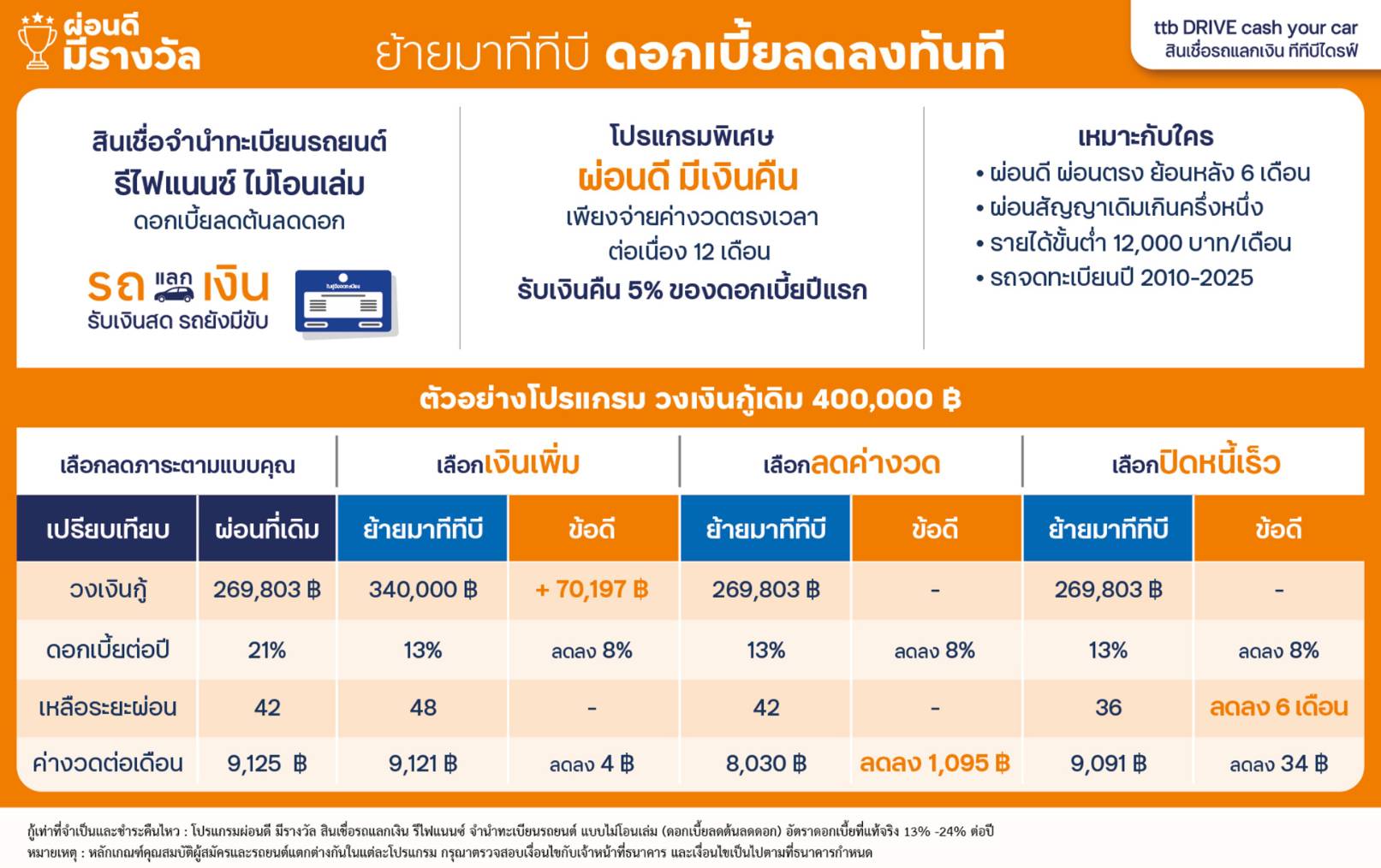สนใจสินเชื่อรถแลกเงิน รีไฟแนนซ์ย้ายมาทีทีบี “ผ่อนดี...มีรางวัล” ได้ตั้งแต่วันที่ 17 เมษายน 2568 – 31 สิงหาคม 2568