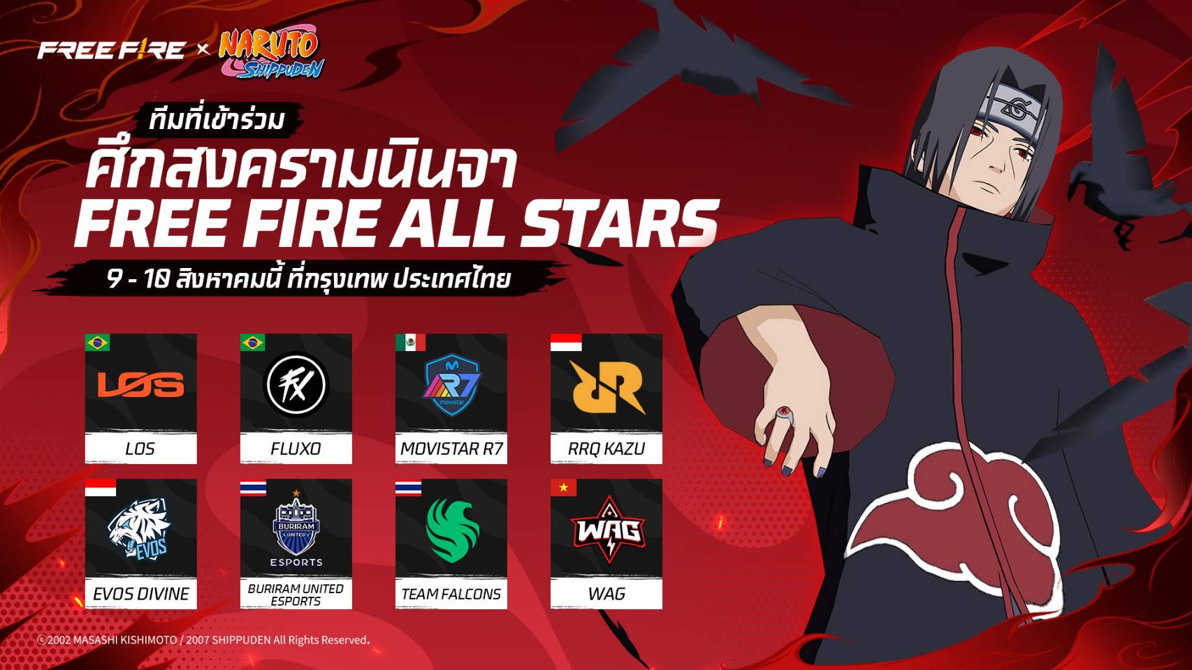 · ถ่ายทอดการปะทะเดือดระหว่างนินจาจากหมู่บ้านโคโนฮะและเหล่านินจาแสงอุษา กำลังจะเริ่มขึ้นใน Free Fire All Stars: ศึกสงครามนินจา 8 ทีมโปรเพลเยอร์ พร้อมเข้าต่อสู้เพื่อศักดิ์ศรีใน งานออฟไลน์ที่ยิ่งใหญ่ที่สุด ใจกลางกรุงเทพฯ! พร้อมระเบิดความมันส์ในสมรภูมิกลางกรุงเทพ 9 – 10 ส.ค.นี้!