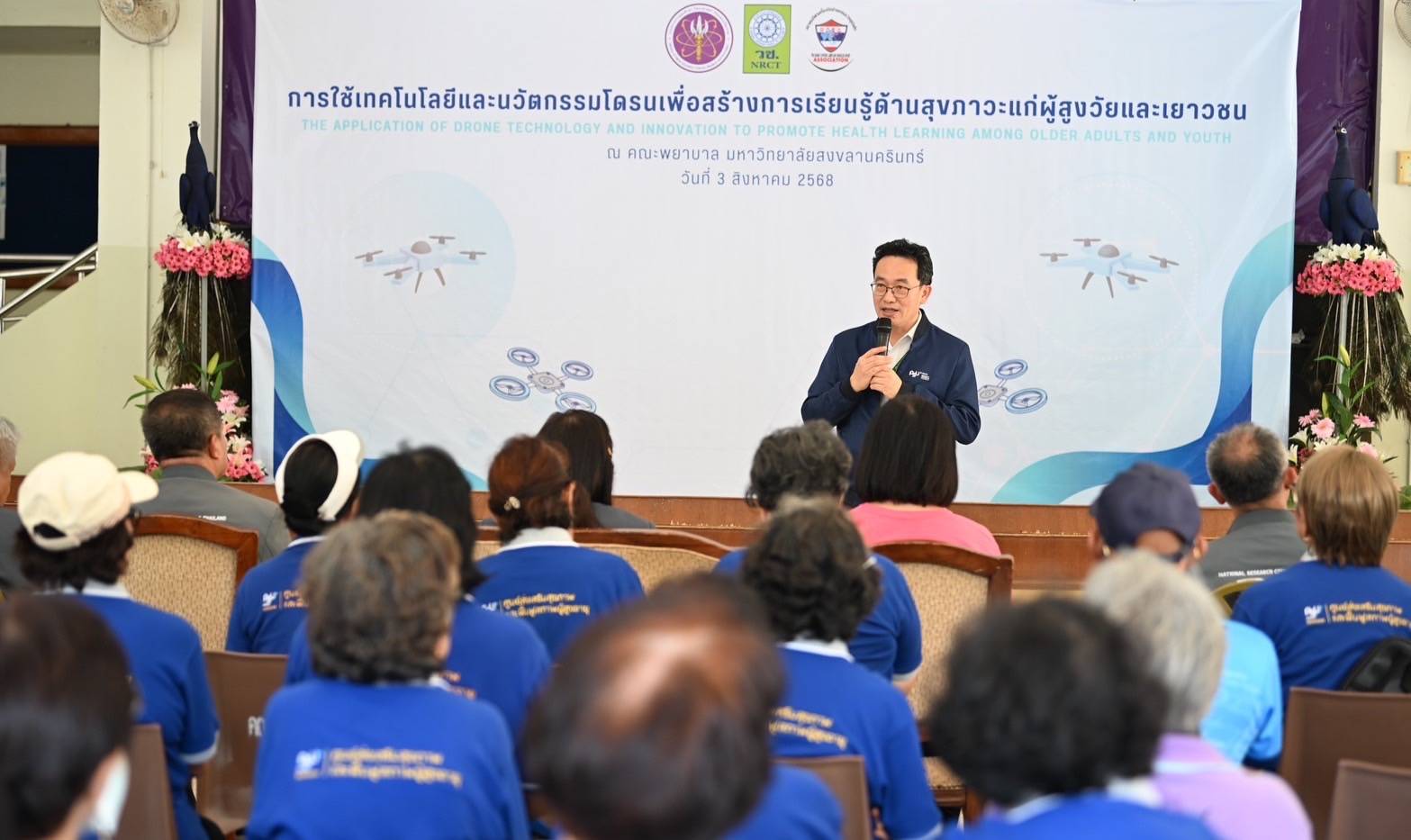วันที่ 3 สิงหาคม 2568 คณะพยาบาลศาสตร์ มหาวิทยาลัยสงขลานครินทร์(ม.อ.) ศูนย์วิจัยเพื่อสุขภาพและการดูแลต่อเนื่องคณะพยาบาลศาสตร์ ม.อ. ศูนย์ส่งเสริม และฟื้นฟูสุขภาพผู้สูงอายุคณะพยาบาลศาสตร์ ม.อ. ได้จัดกิจกรรม “การใช้เทคโนโลยีและนวัตกรรมโดรนเพื่อสร้างการเรียนรู้ด้านสุขภาวะแก่ผู้สูงวัยและเยาวชน“ โดย มีสำนักงานการวิจัยแห่งชาติ(วช.) กระทรวงการอุดมศึกษา วิทยาศาสตร์ วิ จัยและนวัตกรรม และสมาคมกีฬาเครื่องบินจำลองและวิทยุบังคับ ให้การสนับสนุน