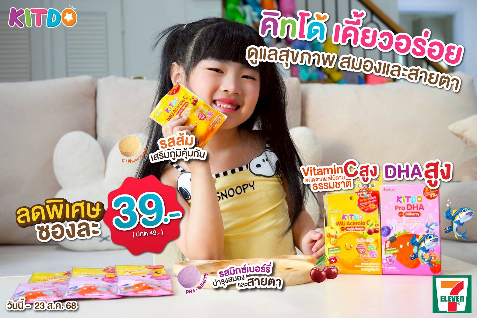 คิทโด้ (KITDO) วิตามินเม็ดเคี้ยวที่คุณพ่อคุณแม่เลือกสรรแล้วให้ลูกรัก เพราะคิทโด้เป็นวิตามินสูตรธรรมชาติ ไม่เติมน้ำตาล ไม่ใส่สารกันเสีย รสชาติหอมอร่อย ทานง่าย และอัดแน่นด้วยสารอาหารสำคัญ เพื่อเสริมสร้างพัฒนาการสำหรับหนูๆ น้องๆ ในช่วงเตรียมสอบ และยังดีต่อสุขภาพทุกคนในครอบครัว กลับมาพร้อมโปรโมชั่นราคาพิเศษ! พบกับ คิทโด้ วิตามินเม็ดเคี้ยว 2 สูตร 2 รสชาติ “คิทโด้ ไอมู อะเซโรลา ซี พลัส มัลติวิตามิน” สำหรับเสริมภูมิคุ้มกัน และ “คิทโด้ โปร ดีเอชเอ พลัส บิลเบอร์รี่” สำหรับบำรุงสมองและสายตา ในราคาเพียงซองละ 39 บาท (จากปกติ 49 บาท) พร้อมรับเพิ่มอีก 3 เม็ดในซองทันที (มูลค่า 12 บาท) รวมเป็น 15 เม็ด! พิเศษสำหรับสมาชิก All Member ลดเพิ่มอีก 1 บาท เหลือเพียง 38 บาท ตั้งแต่วันนี้ - 23 สิงหาคม 2568 ซื้อได้ที่เซเว่น อีเลฟเว่น ทุกสาขา