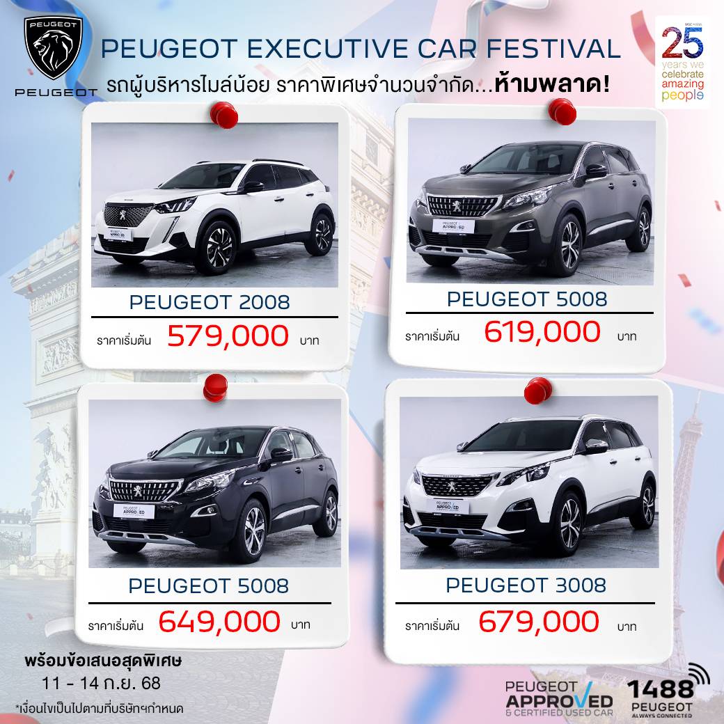 เปอโยต์ ไลอ้อน ออโตโมบิล จัดมหกรรม ‘PEUGEOT EXECUTIVE CAR FESTIVAL’ รถผู้บริหารป้ายแดง ราคาดี ดีลโดนใจ ดอกเบี้ยพิเศษ 0% พร้อมลุ้นรับบัตรที่พักโรงแรมหรู วันนี้ถึง 14 กันยายน 2568 ที่โชว์รูมสุขุมวิท และเกษตร-นวมินทร์