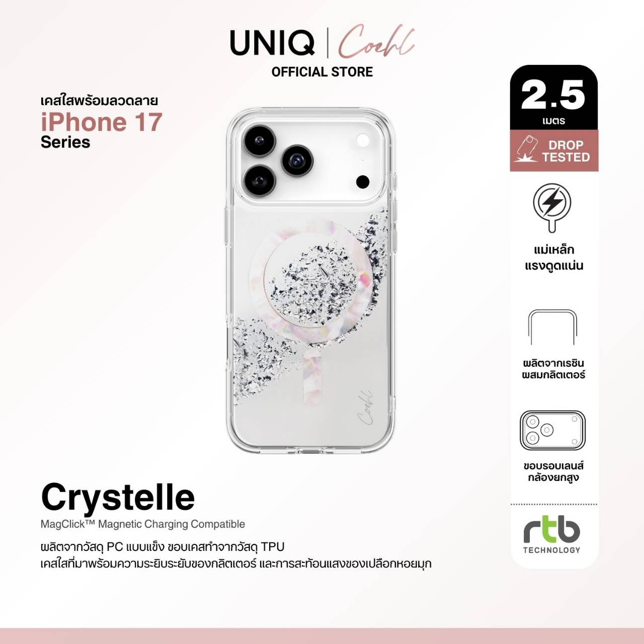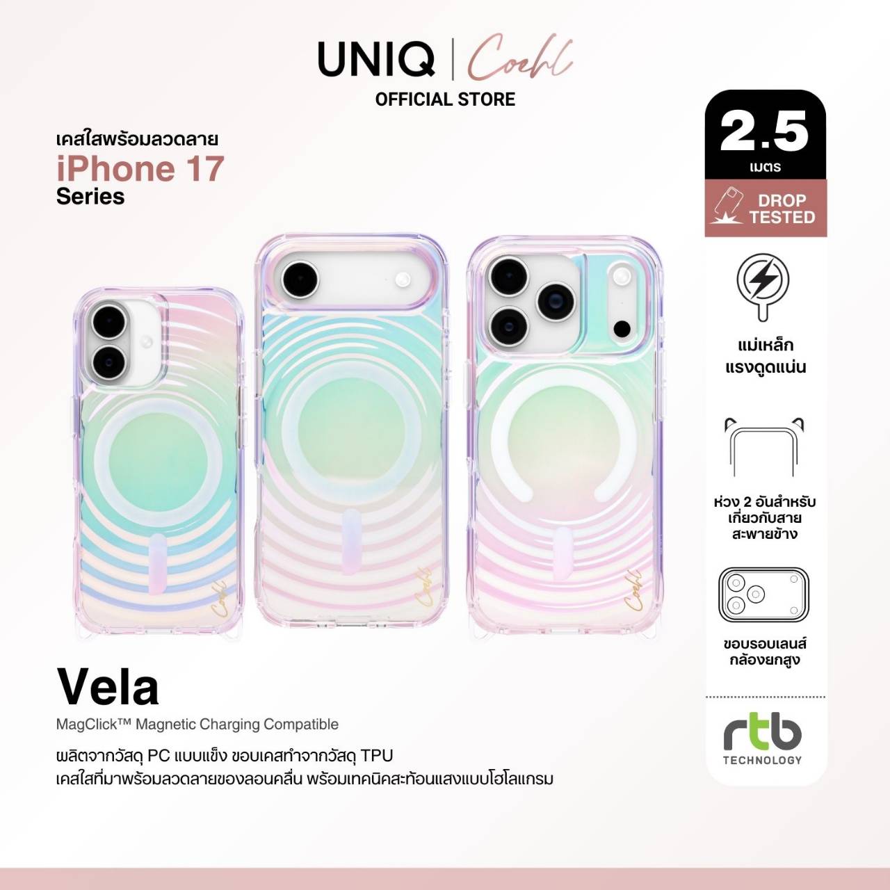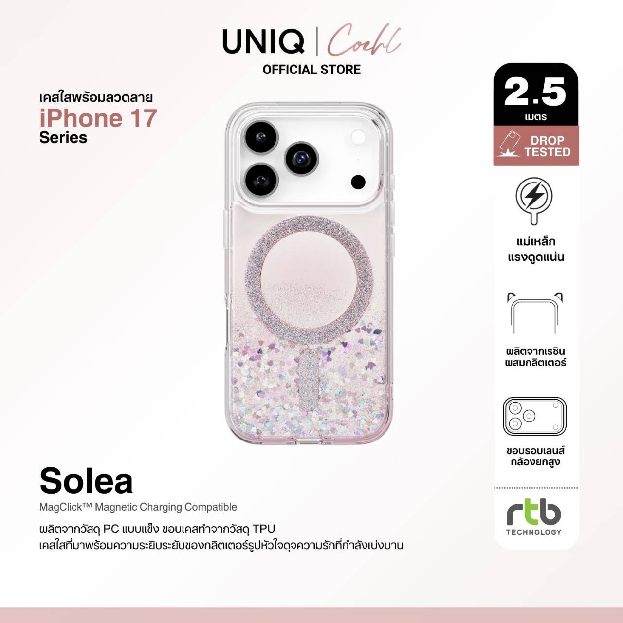 บริษัท อาร์ทีบี เทคโนโลยี จำกัด ผู้นำเข้าและจัดจำหน่ายสินค้าแกดเจ็ตรายใหญ่ในประเทศไทย เดินหน้าสร้างประสบการณ์แฟชั่นที่ผสานเทคโนโลยีอย่างมีสไตล์ ด้วยการเปิดตัวเคสคอลเลกชันใหม่สำหรับ iPhone 17 Series จากแบรนด์ COEHL แบรนด์ในเครือของ UNIQ ที่ออกแบบมาเพื่อผู้หญิงยุคใหม่ที่มีหลากหลายบทบาทในแต่ละวัน ทั้งการทำงาน ท่องเที่ยว และใช้ชีวิตในแบบของตนเอง โดยดีไซน์ของ COEHL ได้รับแรงบันดาลใจจากธรรมชาติ ผสานลวดลายและเท็กซ์เจอร์ที่เรียบง่าย ละมุน แต่เต็มไปด้วยเอกลักษณ์ โดยในคอลเลกชันนี้ประกอบด้วยเคสทั้งหมด 5 แบบ ได้แก่ เคสใสที่มาพร้อมลวดลาย (IML Designer Cases) เคสใสที่ผสมเรซินและกลิตเตอร์เป็นเนื้อเดียวกับตัวเคส (Resin Designer Cases) เคสน้ำตกกลิตเตอร์ (Waterfall Designer Case) เคสหนังวีแกนสุดหรู และเคสซิลิโคนดีไซน์มินิมอล ตอบโจทย์ผู้ใช้งานที่ต้องการทั้งดีไซน์ที่โดดเด่นและการปกป้องที่เหนือระดับ