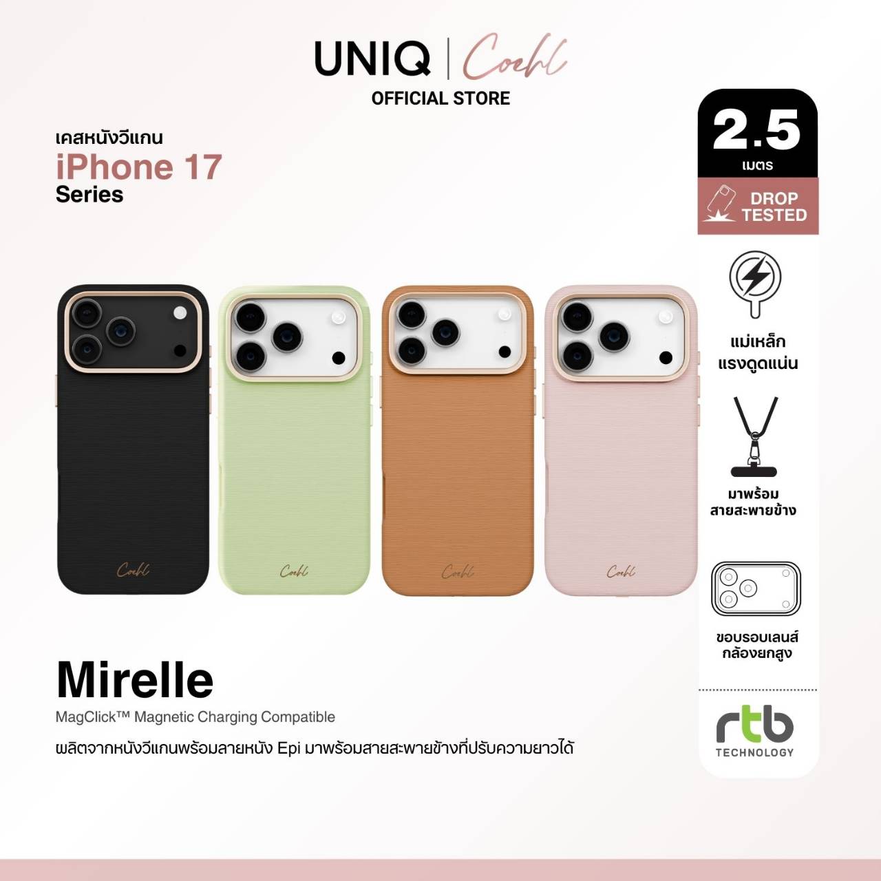 Mirelle เคสที่เป็นตัวแทนของความเรียบหรูและคลาสสิกอย่างมีระดับ มาพร้อมโครงสร้างเคสแบบไฮบริด ด้านนอกผลิตจากหนังวีแกนคุณภาพระดับพรีเมียม พร้อมลายหนัง Epi ที่ผ่านการฟอกและย้อมสีอย่างละเอียดจนมีผิวสัมผัสเป็นลายเส้นนูนคล้ายลอนคลื่นแนวนอน ช่วยให้ทนทานและทนต่อรอยขีดข่วนได้เป็นอย่างดี พร้อมคุณสมบัติกันน้ำ ด้านในบุด้วยไมโครไฟเบอร์เนื้อนุ่ม รองรับการชาร์จแบบแม่เหล็กไร้สายด้วยวงแหวน MagClick™ สามารถรองรับแรงกระแทกจากการตกจากที่สูงได้ถึง 8 ฟุต (2.5 ม.) มาพร้อมสายสะพายข้างสีเดียวกับเคส ผลิตจากเชือกถักเนื้อนุ่ม พร้อมฮุคและตัวล็อคโลหะสีทองเมทัลลิก สามารถถอดและปรับความยาวได้ตามต้องการ วางจำหน่ายในราคา 1590 บาท