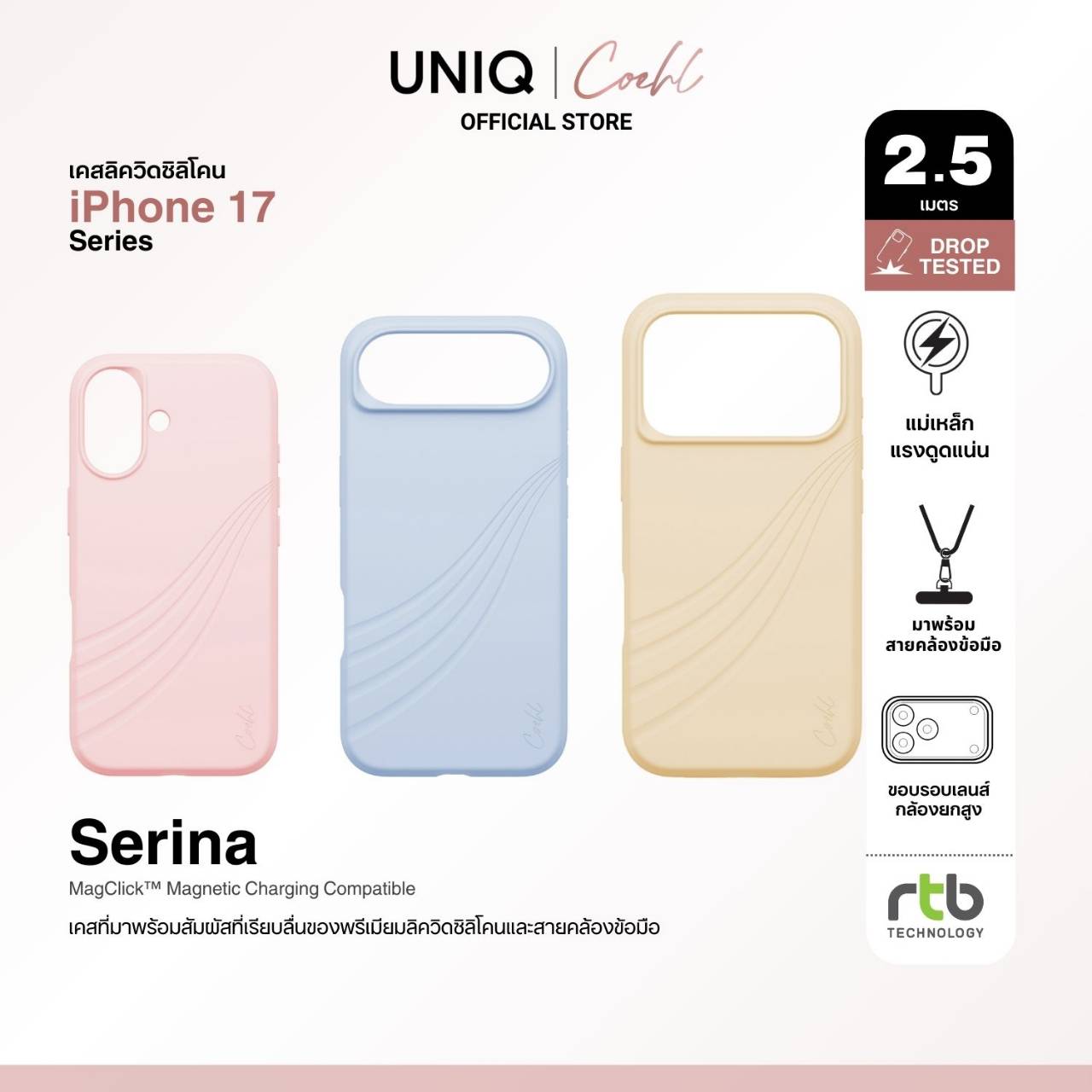Serina เคสที่โดดเด่นด้วยดีไซน์มินิมอล พร้อมเส้นโค้งที่พลิ้วไหวอย่างอ่อนช้อยเสมือนการบรรจบกันของท้องฟ้า สายลม และผืนทราย ผลิตจากพรีเมียมลิควิดซิลิโคน ให้สัมผัสนุ่ม ลื่นมือ พร้อมเทคโนโลยีเคลือบผิว ช่วยลดการดูดซับฝุ่นและป้องกันรอยนิ้วมือได้อย่างมีประสิทธิภาพ ด้านในบุด้วยไมโครไฟเบอร์เนื้อนุ่มเพื่อรองรับแรงกระแทกและป้องกันรอยขีดข่วน โครงสร้างเคสแบบไฮบริดที่ผสานขอบยืดหยุ่นกับแผ่นหลังแข็งมอบการปกป้องรอบด้านแบบ 360 องศา รองรับการชาร์จแบบแม่เหล็กไร้สายด้วยวงแหวน MagClick™ สามารถรองรับแรงกระแทกจากการตกจากที่สูงได้ถึง 8 ฟุต (2.5 ม.) มาพร้อมสายคล้องข้อมือที่ผลิตจากเชือกถักเนื้อนุ่ม น้ำหนักเบา ทนทาน วางจำหน่ายในราคา 1290 บาท
