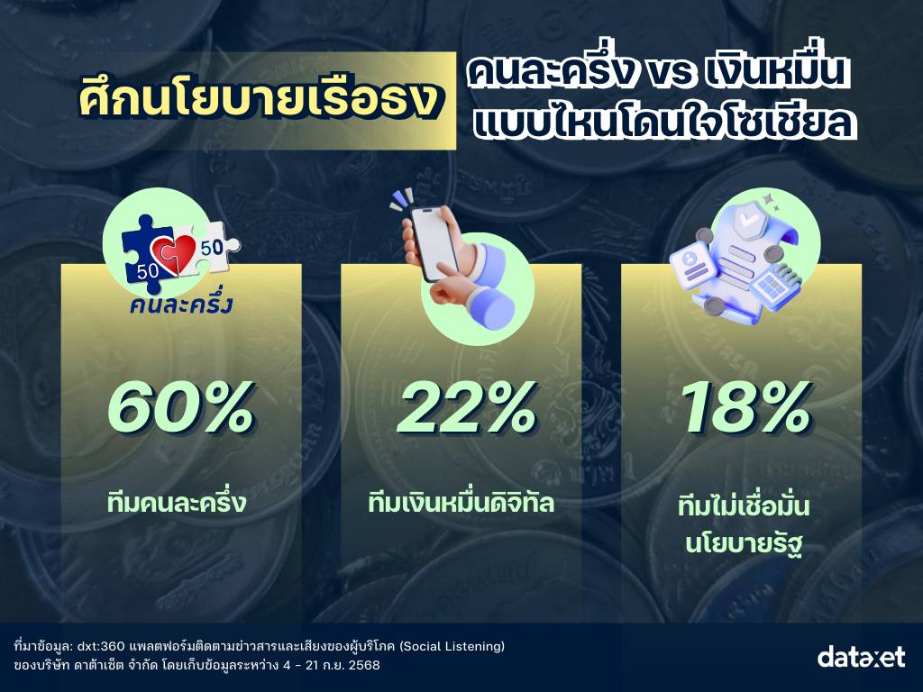 บริษัท ดาต้าเซ็ต จำกัด ได้ทำการรวบรวมข้อมูลผ่านเครื่องมือ dxt:360 เพื่อฟังเสียงในสื่อสังคมออนไลน์ (Social Listening) ในช่วงวันที่ 4 กันยายน – 21 กันยายน 2568 เพื่อถอดรหัสว่า ประชาชนอยากเห็นโครงการ “คนละครึ่ง” ในรูปแบบใดเมื่อมีการนำกลับมาใช้อีกครั้ง ซึ่งจะเผยให้เห็น Insight ที่ซ่อนอยู่เบื้องหลังการพูดคุยในสังคมออนไลน์ครั้งนี้