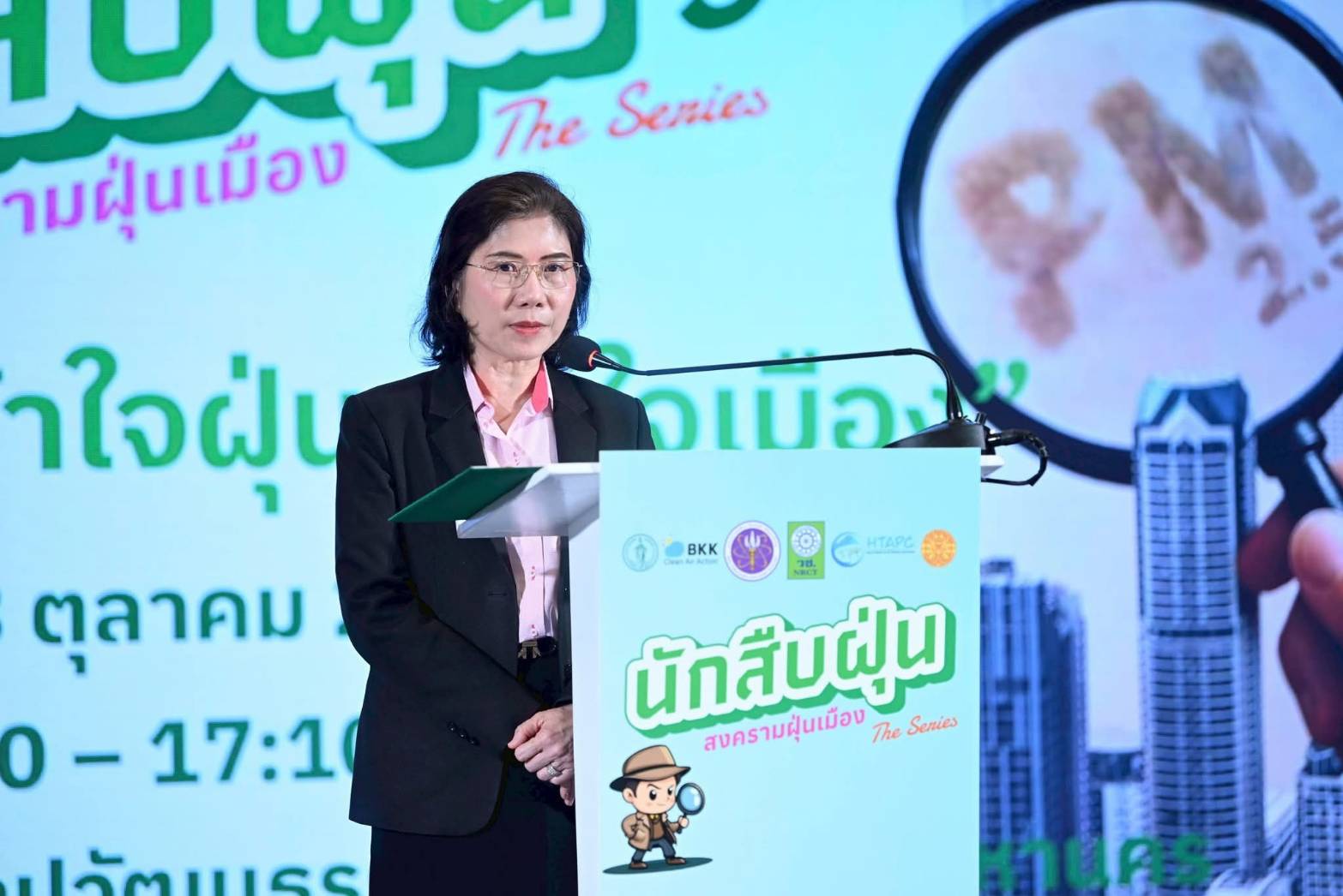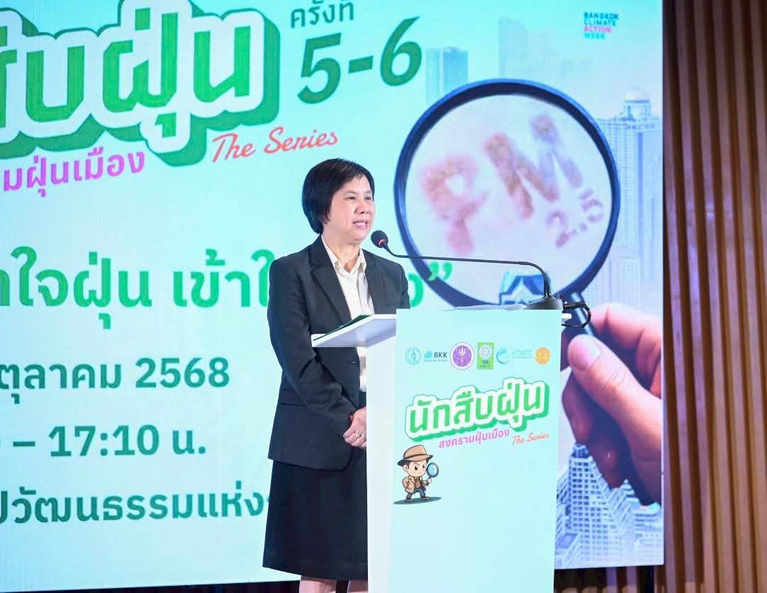 นางเลิศลักษณ์ ลีลาเรืองแสง รองปลัดกรุงเทพมหานคร กล่าวว่า ในนามของกรุงเทพมหานคร รู้สึกเป็นเกียรติและยินดีอย่างยิ่งที่ได้กล่าวต้อนรับทุกท่านในกิจกรรม “นักสืบฝุ่น The Series” ครั้งที่ 5 ภายใต้หัวข้อ “สืบจากฝุ่น” และครั้งที่ 6 ภายใต้หัวข้อ “เข้าใจฝุ่น เข้าใจเมือง” ในวันนี้ ซึ่งจัดขึ้นด้วยวัตถุประสงค์เดียวกัน คือเพื่อแลกเปลี่ยนเรียนรู้และร่วมกันแสวงหาทางออกต่อปัญหาฝุ่น PM2.5 และหมอกควัน ที่ยังคงเป็นวิกฤตสำคัญของประเทศไทยโดยเฉพาะในเขตเมืองใหญ่อย่างกรุงเทพฯ ช่วงเช้า เน้นการศึกษาความซับซ้อนของฝุ่น ตั้งแต่แหล่งกำเนิด ยานพาหนะ องค์ประกอบฝุ่นในระดับความสูงต่าง ๆ ไปจนถึงกลไกการเกิดมลพิษทุติยภูมิ