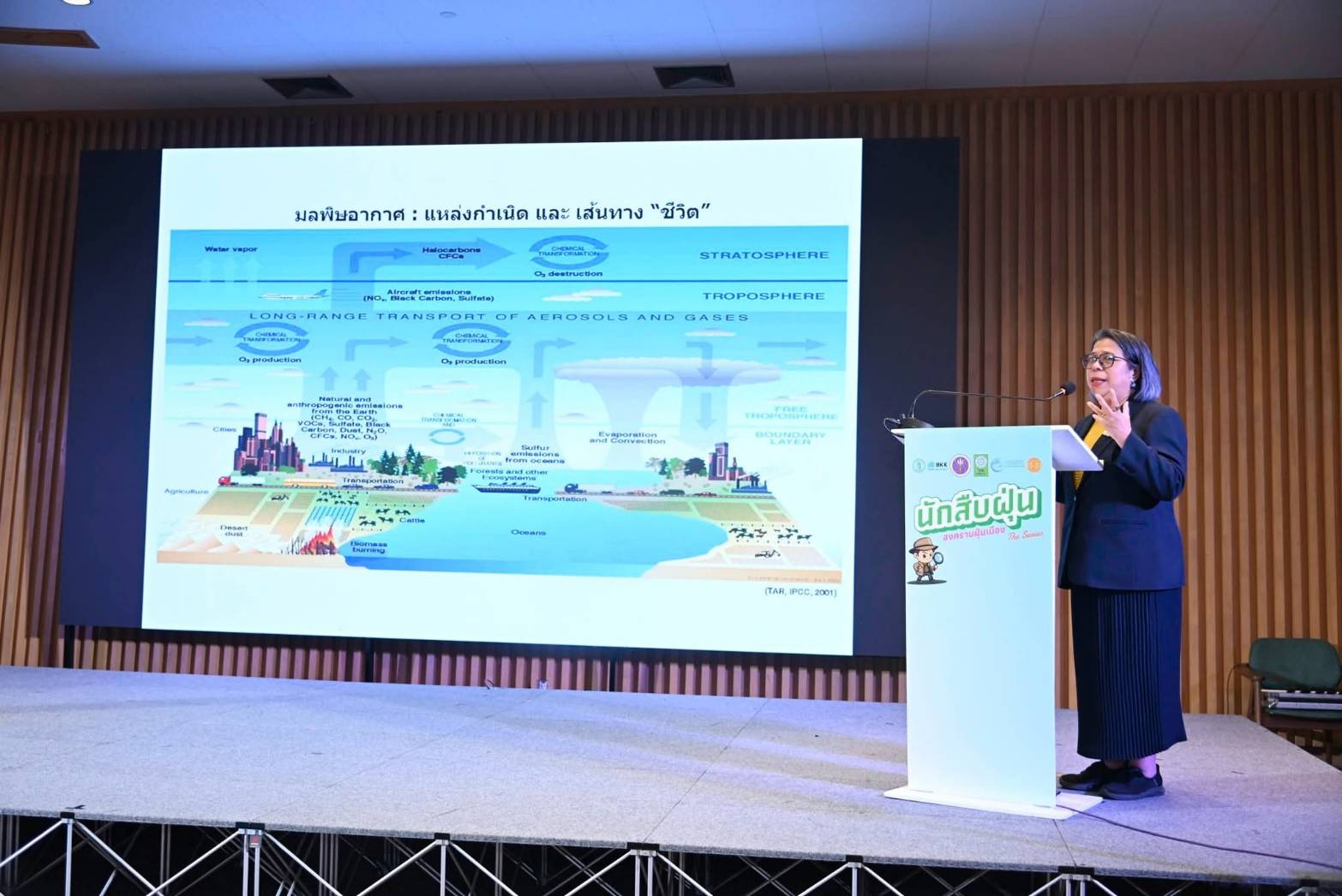 - รศ.ดร.สุรัตน์ บัวเลิศ หัวหน้ากลุ่มวิจัยวิทยาศาสตร์บรรยากาศ คณะสิ่งแวดล้อม มหาวิทยาลัยเกษตรศาสตร์ ในหัวข้อ “สืบการเปลี่ยนแปลงลักษณะและองค์ประกอบฝุ่นในพื้นที่กรุงเทพมหานครตามระดับความสูง”