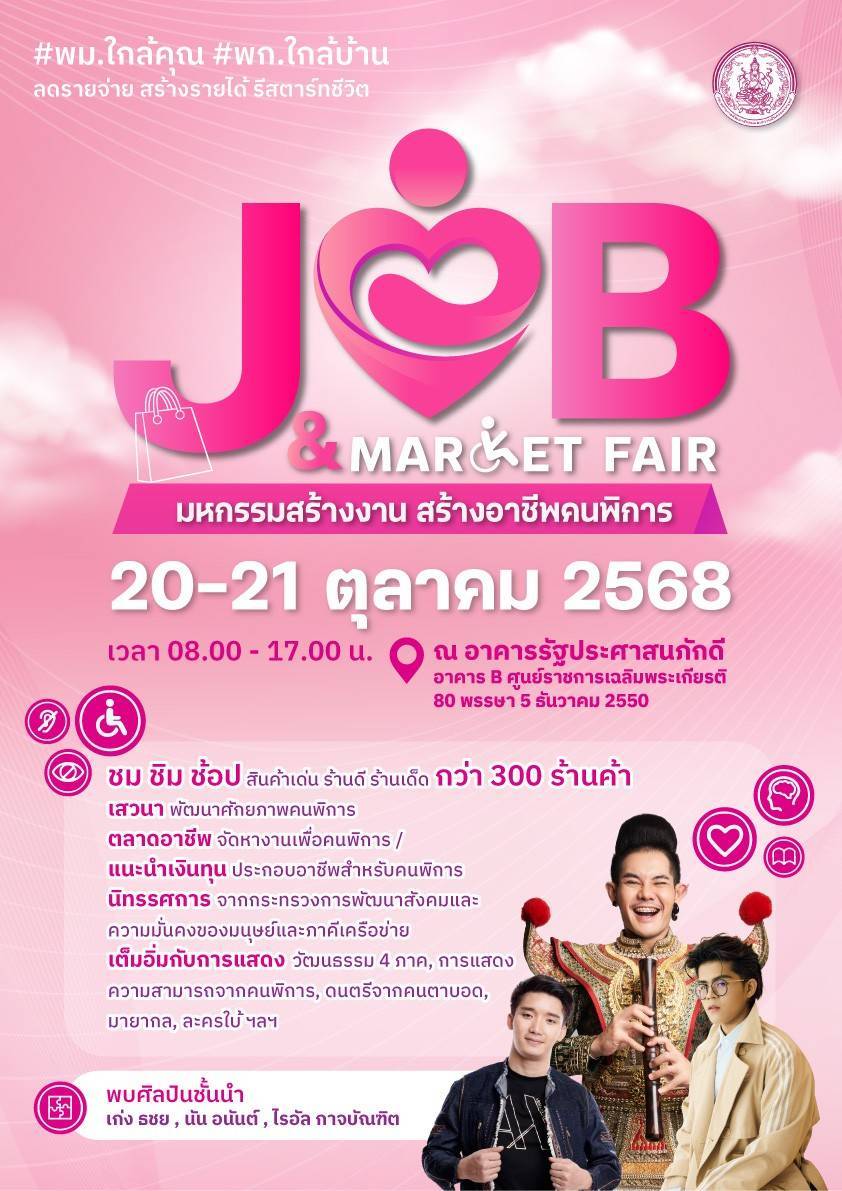 นายกันตพงศ์ กล่าวต่อไปว่า สำหรับงาน "Job and Market Fair : มหกรรมสร้างงาน สร้างอาชีพคนพิการ" นั้น เป็นหนึ่งในภารกิจของการขับเคลื่อนนโยบายไปสู่การปฏิบัติ โดยมีเป้าหมายสำคัญในการพัฒนาทักษะอาชีพ เชื่อมโยงตลาดแรงงาน และเปิดเวทีให้คนพิการได้แสดงศักยภาพอย่างเต็มที่ โดยได้รับความร่วมมืออย่างยิ่งจากภาคีเครือข่ายทุกภาคส่วน ทั้งภาครัฐ ภาคเอกชน และภาคประชาสังคม ซึ่งภายในงานนี้ มีกิจกรรมที่น่าสนใจมากมาย อาทิ พิธีเปิดงานฯ ในวันที่ 20 ตุลาคม 2568 โดย นายอัครา พรหมเผ่า รัฐมนตรีว่าการกระทรวงการพัฒนาสังคมและความมั่นคงของมนุษย์ เป็นประธานเปิดงาน การลงนามบันทึกความร่วมมือ “ด้านการเสริมสร้างโอกาสการจ้างงานและการประกอบอาชีพ