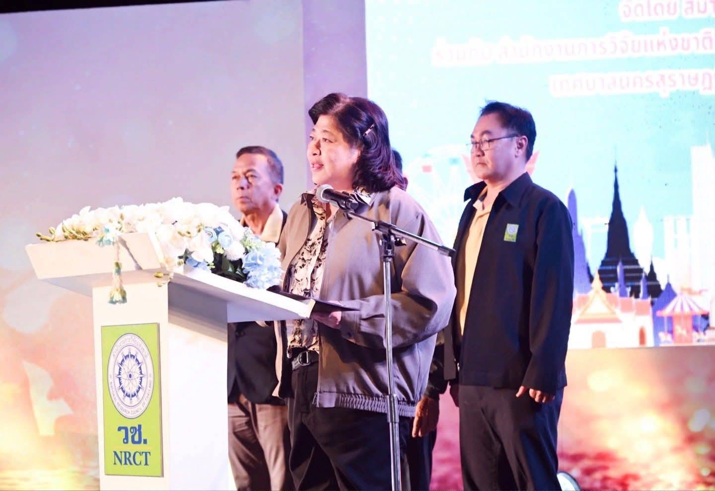 วันที่ 12 ตุลาคม 2568 สำนักงานการวิจัยแห่งชาติ(วช.) กระทรวงการอุดมศึกษา วิทยาศาสตร์ วิจัยและนวัตกรรม โดย ดร.วิภารัตน์ ดีอ่อง ผู้อำนวยการสำนักงานการวิจัยแห่งชาติ ร่วมกิจกรรมในการแสดงโดรนแปรอักษรเพื่อส่งเสริมมรดกทางวัฒนธรรมและการท่องเที่ยว ในงานประเพณี ชักพระและแข่งเรือยาว จังหวัดสุราษฎร์ธานี ประจำปี 2568 โดยมี นายหัสชัย เรืองนุ้ย รองนายกเทศมนตรีนครสุราษฎร์ธานี นางโสภา กาญจนะ นายกองค์การบริหารส่วนจังหวัดสุราษฎร์ธานี นางสาวกานต์สินี โอภาสรังสรรค์ สมาชิกสภาผู้แทนราษฎร จ.สุราษฎร์ธานี คณะผู้บริหารท้องถิ่น ผู้ทรงคุณวุฒิจาก วช. สื่อมวลชน และแขกผู้มีเกียรติ เข้าร่วมงาน ณ ลานสะพานนริศ อำเภอเมืองสุราษฎร์ธานี จังหวัดสุราษฎร์ธานี
