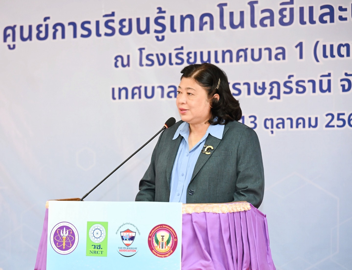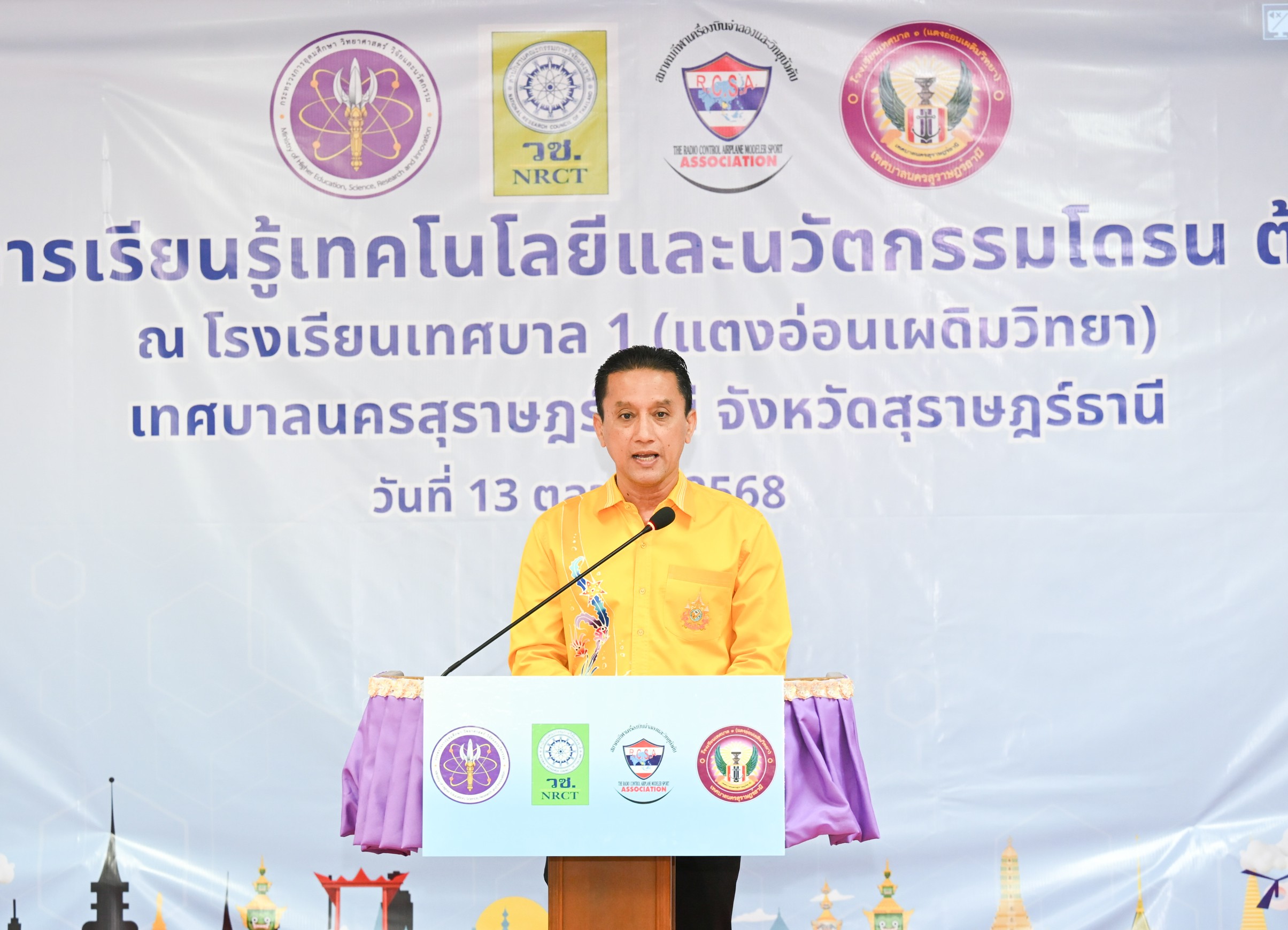 วันที่ 13 ตุลาคม 2568 สำนักงานการวิจัยแห่งชาติ (วช.) กระทรวงการอุดมศึกษา วิทยาศาสตร์ วิจัยและนวัตกรรม โดย ดร.วิภารัตน์ ดีอ่อง ผู้อำนวยการสำนักงานการวิจัยแห่งชาติ เป็นประธานในพิธีเปิด "ศูนย์การเรียนรู้เทคโนโลยีและนวัตกรรมโดรน ต้นแบบภาคใต้" ในการนี้ได้รับเกียรติจาก นายทัศนัย เรืองนุ้ย รองนายกเทศมนตรีนครสุราษฎร์ธานี นายนิวัฒน์ กู้เขียว ผู้อำนวยการโรงเรียนเทศบาล 1 สุราษฎร์ธานี (แตงอ่อนเผดิมวิทยา) คณะผู้ทรงคุณวุฒิจาก วช. และ อาจารย์พิศิษฐ์ มิตรเกื้อกูล นายกสมาคมกีฬาเครื่องบินจำลองและวิทยุบังคับ พร้อมด้วยผู้บริหารสถานศึกษาในพื้นที่ ให้การต้อนรับ ณ โรงเรียนเทศบาล 1 สุราษฎร์ธานี (แตงอ่อนเผดิมวิทยา) จังหวัดสุราษฎร์ธานี