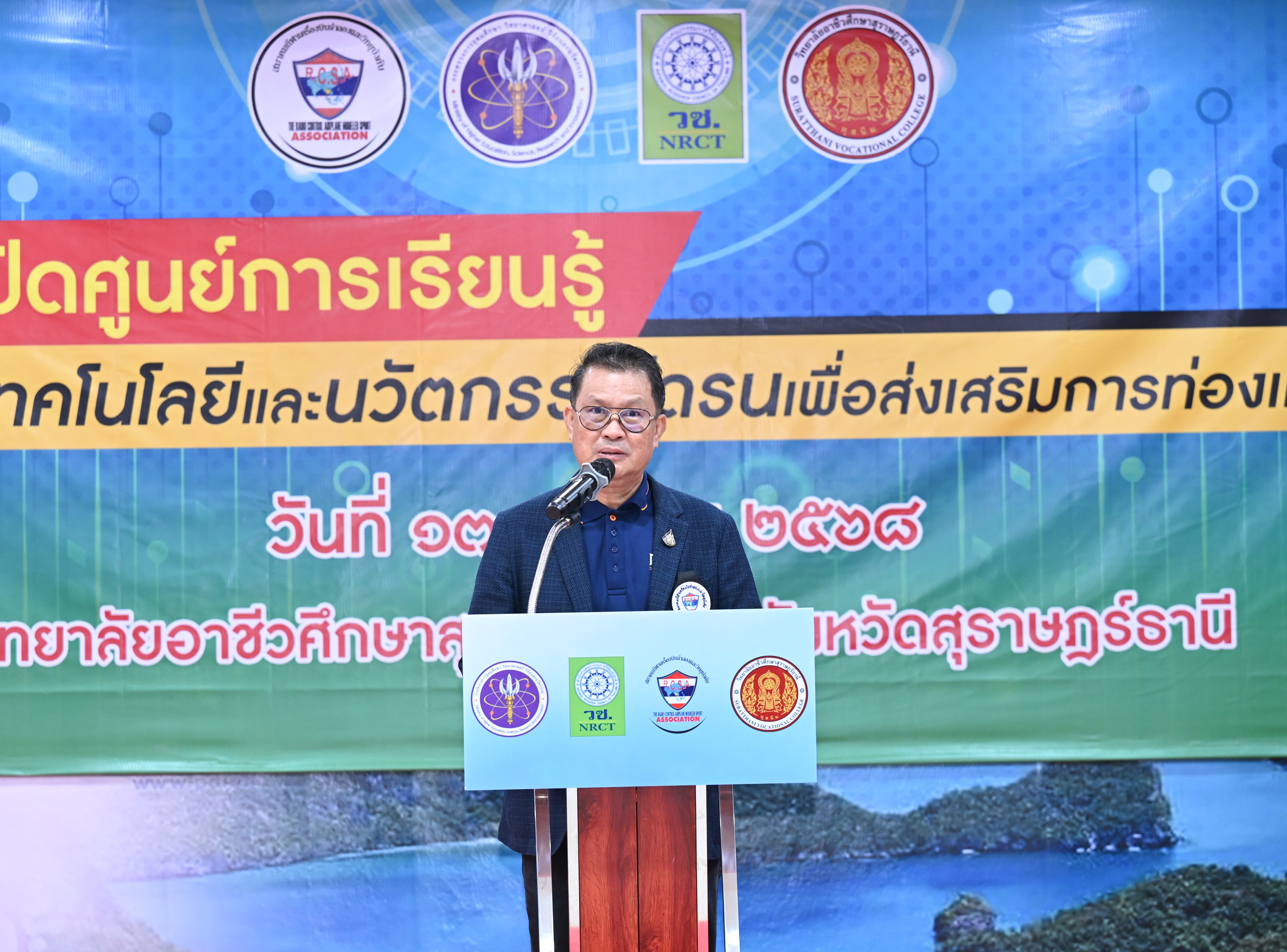 กล่าวว่า ในนามของ โรงเรียนเทศบาล 1 สุราษฎร์ธานี (แตงอ่อนเผดิมวิทยา) และตัวแทนสถานศึกษาในพื้นที่จังหวัดสุราษฎร์ธานี ขอขอบคุณ วช. ที่ได้เล็งเห็นความสำคัญและให้เกียรติเลือกโรงเรียนของเราเป็นพื้นที่ในการจัดตั้ง “ศูนย์การเรียนรู้เทคโนโลยีและนวัตกรรมโดรน ต้นแบบภาคใต้” ศูนย์แห่งนี้ถือเป็นอีกก้าวสำคัญของการยกระดับการศึกษาในระดับท้องถิ่นที่จะเปิดโอกาสให้เยาวชนของเราได้เรียนรู้เทคโนโลยีที่ทันสมัยได้ลงมือปฏิบัติจริง และสามารถต่อยอดไปสู่การสร้างนวัตกรรมในอนาคต