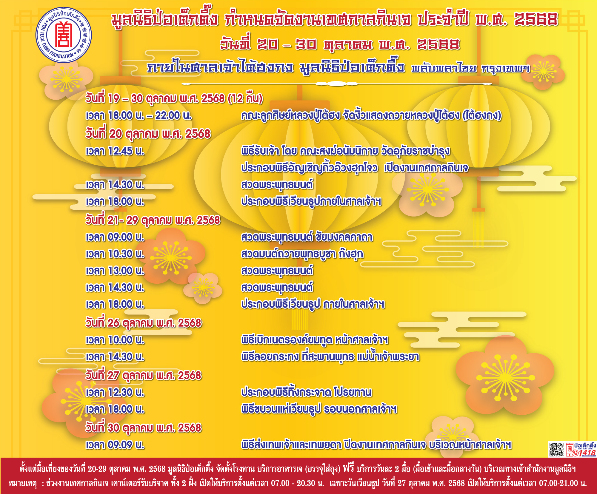 ระหว่างวันที่ 20 - 30 ตุลาคม 2568 มูลนิธิป่อเต็กตึ๊ง โดย นายวิเชียร เตชะไพบูลย์ ประธานกรรมการ ขอเชิญชวนศิษยานุศิษย์และสาธุชนทุกท่าน ร่วมถือศีล อิ่มบุญ อิ่มใจ ละเว้นเนื้อสัตว์ เนื่องในเทศกาลกินเจ ประจำปี 2568 สักการะหลวงปู่ไต้ฮง เพื่อความเป็นสิริมงคล ทำบุญประทีปโคมไฟ (เต็งลั้ง) ถวายหลวงปู่ไต้ฮงเพื่อความเจริญรุ่งเรือง และในวันจันทร์ที่ 27 ตุลาคม 2568 ขอเชิญร่วมพิธีเวียนธูปศักดิ์สิทธิ์รอบนอกศาลเจ้าไต้ฮงกง ขอพรให้คุ้มครอง แคล้วคลาดปลอดภัย ณ ศาลเจ้าไต้ฮงกง มูลนิธิป่อเต็กตึ๊ง พลับพลาไชย กรุงเทพฯ