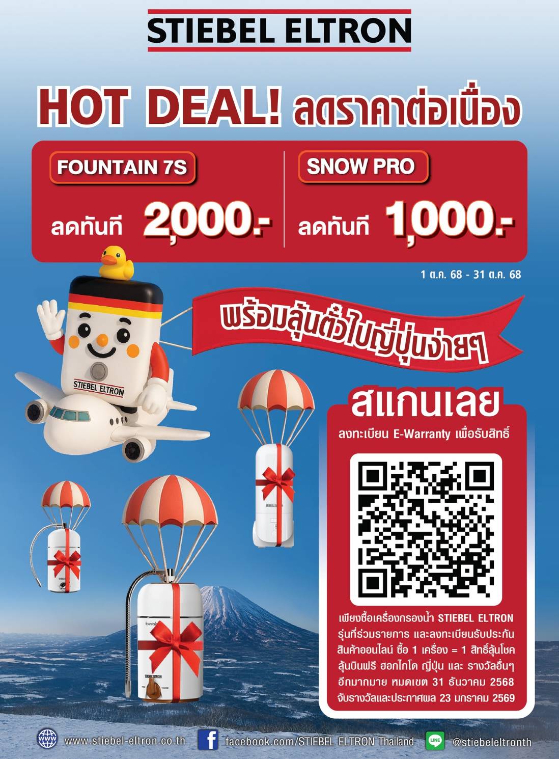 สตีเบล เอลทรอน ได้จัดโปรโมชันพิเศษสำหรับลูกค้าเมื่อซื้อผลิตภัณฑ์เครื่องกรองน้ำ ต่อที่หนึ่ง! รับส่วนลด 2000 บาท สำหรับเครื่องกรองน้ำรุ่น FOUNTAIN 7S และส่วนลด 1000 บาท สำหรับเครื่องกรองน้ำรุ่น SNOW PRO ต่อที่สอง! ร่วมลุ้นเป็นผู้โชคดีกับกิจกรรม ‘ลุ้นบินฟรี เที่ยวญี่ปุ่นกับ STIEBEL ELTRON’ ชิงรางวัลใหญ่ ตั๋วเครื่องบินไป-กลับฮอกไกโด ประเทศญี่ปุ่น 2 ที่นั่ง จำนวน 1 รางวัล พร้อมรางวัลผลิตภัณฑ์เครื่องทำน้ำอุ่นและเครื่องกรองน้ำจากสตีเบล เอลทรอน จำนวน 19 รางวัล รวมมูลค่ากว่า 160000 บาท เมื่อซื้อเครื่องกรองน้ำรุ่นที่ร่วมรายการและลงทะเบียนรับประกัน e-Warranty 1 เครื่อง ต่อ 1 สิทธิ์ ระหว่างวันนี้ – 31 ธันวาคม 2568 ทั้งนี้ คาดว่าแคมเปญดังกล่าวจะกระตุ้นยอดขายเครื่องกรองน้ำของบริษัทฯ ได้ราว 30%