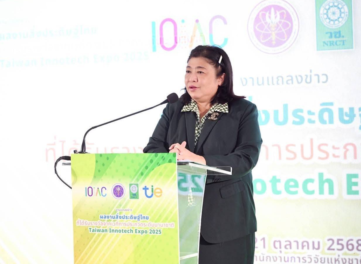 วันที่ 21 ตุลาคม 2568 สำนักงานการวิจัยแห่งชาติ (วช.) กระทรวงการอุดมศึกษา วิทยาศาสตร์ วิจัยและนวัตกรรม จัดงานแถลงข่าว “ผลงานสิ่งประดิษฐ์ไทยที่ได้รับรางวัลจากเวทีการประกวดระดับนานาชาติ Taiwan Innotech Expo 2025” (TIE 2025) โดย ดร.วิภารัตน์ ดีอ่อง ผู้อำนวยการสำนักงานการวิจัยแห่งชาติ เป็นประธานในพิธี พร้อมด้วย คณะผู้บริหาร วช. นักวิจัย และสื่อมวลชน เข้าร่วม ณ ศูนย์ข้อมูลสารสนเทศกลางด้านวิทยาศาสตร์ วิจัยและนวัตกรรมของประเทศ วช.