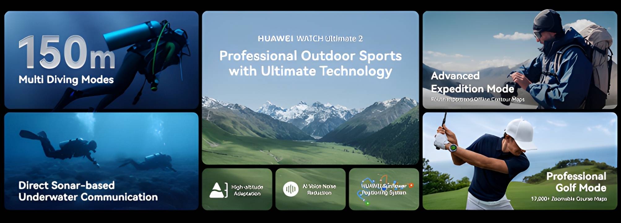 โดดเด่นด้วยความสามารถในการสวมใส่ดำน้ำลึกได้ สูงสุด 150 เมตร พร้อมระบบสื่อสารใต้น้ำที่ช่วยให้ผู้ใช้ส่งข้อความหรืออีโมจิผ่านคลื่นโซนาร์ได้ในระยะ 30 เมตร และสูงสุด 60 เมตรเมื่อเข้าใช้งานฟีเจอร์ SOS เสริมความปลอดภัยด้วยฟีเจอร์ขอความช่วยเหลือฉุกเฉินจากใต้น้ำ ตอบโจทย์นักดำน้ำและสายผจญภัยตัวจริง สำหรับสายออกกำลังกายกลางแจ้ง หัวเว่ยเพิ่มโหมด Trail Running และ Expedition Mode ที่รองรับการใช้งานแบบออฟไลน์ด้วยแผนที่นำทางกลับตามเส้นทางเดิม (Route-back) และการแจ้งเตือนความปลอดภัยเมื่ออยู่เหนือระดับความสูงกว่า 4500 เมตร รวมถึง Golf Mode ที่ครอบคลุมกว่า 17000 สนามทั่วโลก พร้อมระบบคำนวณระยะทางตามความชันและการมีแคดดี้ดิจิทัลส่วนตัวกับฟีเจอร์ Trajectory Replay