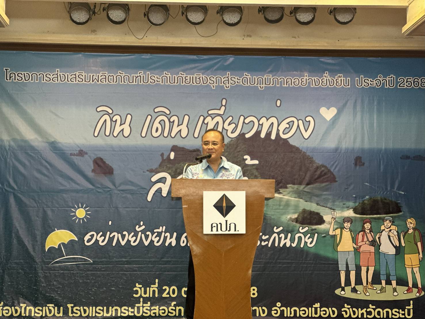 เลขาธิการ คปภ. กล่าวว่า จังหวัดกระบี่เป็นหนึ่งในจังหวัดท่องเที่ยวหลักของประเทศ มีรายได้จากการท่องเที่ยวสูงเป็นอันดับต้น ๆ จากข้อมูลตั้งแต่เดือนมกราคม - กันยายน 2568 จังหวัดกระบี่มีรายได้จากการท่องเที่ยวกว่า 77917 ล้านบาท จากนักท่องเที่ยวทั้งชาวไทยและต่างชาติ รวมกว่า 4.7 ล้านคน สะท้อนถึงศักยภาพและแนวโน้มการเติบโตของภาคการท่องเที่ยวอย่างต่อเนื่อง แต่ความเติบโตดังกล่าวก็มีความเสี่ยงจากภัยธรรมชาติ เช่น น้ำท่วม ดินถล่ม และอุบัติเหตุจากการเดินทาง ทั้งอุบัติเหตุทางรถยนต์ อุบัติเหตุจากการใช้บริการสถานที่ท่องเที่ยว ที่พัก ร้านอาหาร รวมถึงอุบัติเหตุทางน้ำและทางเรือ