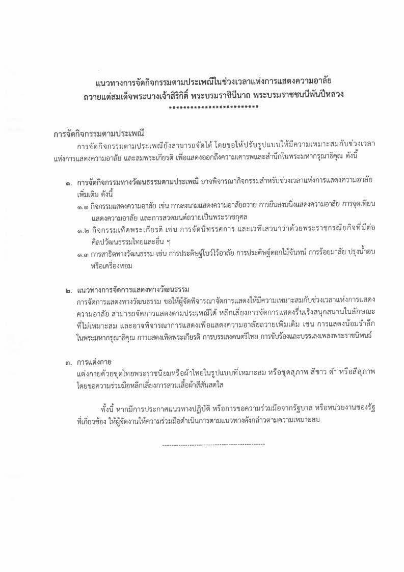๒. แนวทางการจัดการแสดงทางวัฒนธรรม ขอให้ผู้จัดพิจารณาจัดการแสดงให้มีความเหมาะสมกับช่วงเวลาแห่งการแสดงความอาลัย โดยสามารถจัดการแสดงตามประเพณีได้ หลีกเลี่ยงการจัดการแสดงรื่นเริงสนุกสนานในลักษณะที่ไม่เหมาะสม และอาจพิจารณาการแสดงเพื่อแสดงความอาลัยถวายเพิ่มเติม อาทิ การแสดงน้อมรำลึกในพระมหากรุณาธิคุณ การแสดงเทิดพระเกียรติ การบรรเลงดนตรีไทย และการขับร้องและบรรเลงเพลงพระราชนิพนธ์
