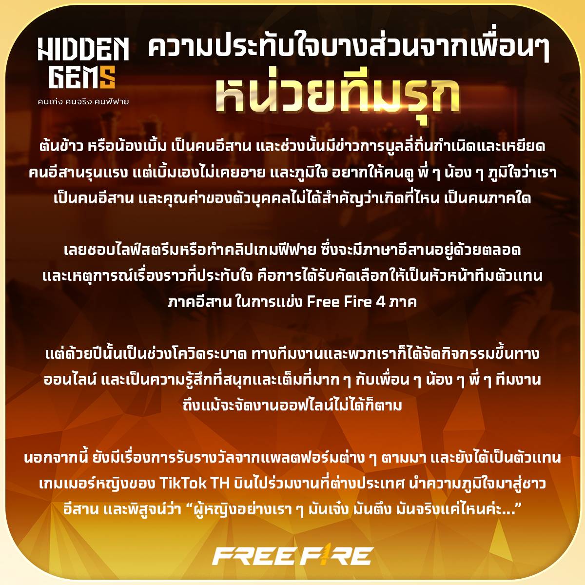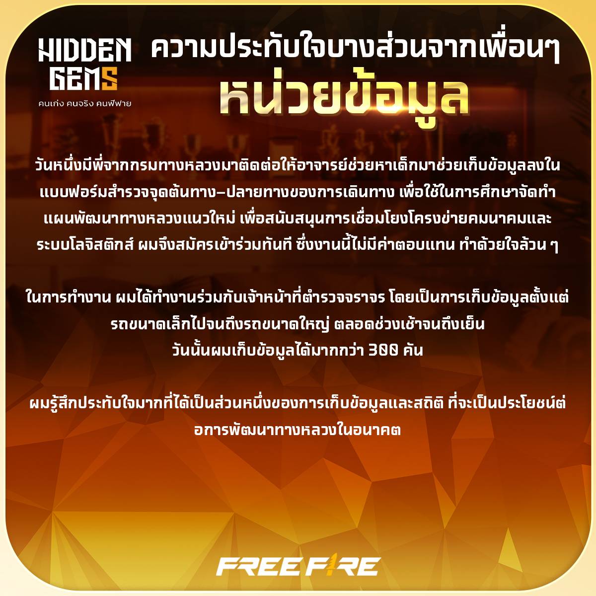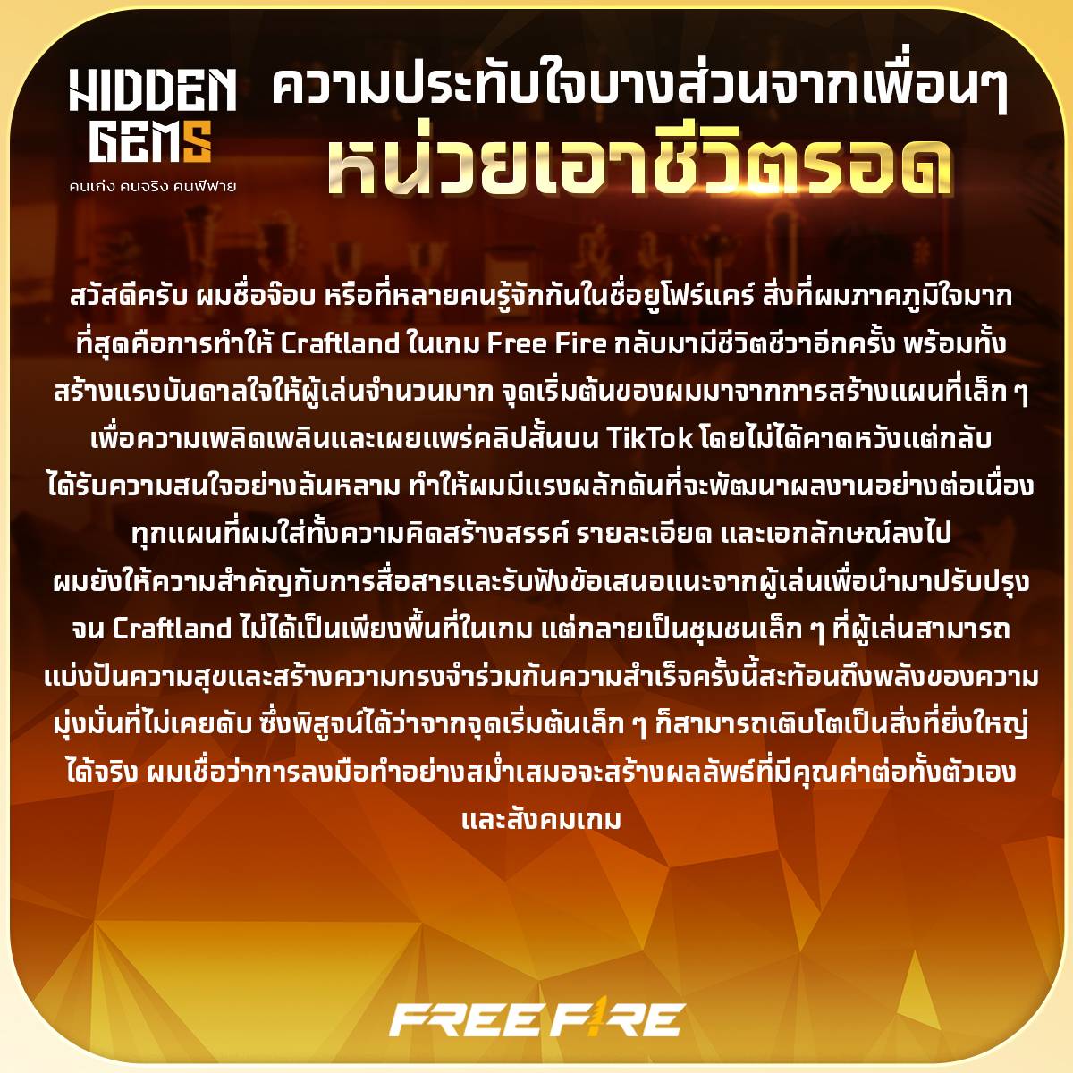 หน่วยดาเมจ (Limitless Heart) ผู้สร้างสรรค์และแบ่งปันความสุขอย่างไม่หยุดยั้ง: เรื่องราวของ “จ้อน” หรือที่รู้จักกันในชื่อ “ยูโฟร์แครี่” ผู้สร้างแรงบันดาลใจและมอบความสนุกให้ผู้เล่นมากมายผ่านโหมด Craftland ซึ่งเป็นโหมดสร้างแผนที่ในเกม Free Fire โดยเริ่มต้นจากการสร้างแผนที่เล็ก ๆ เพื่อความเพลิดเพลิน และพัฒนาด้วยความตั้งใจและความคิดสร้างสรรค์อย่างต่อเนื่องโดยให้ความสำคัญกับการสื่อสารและรับฟังข้อเสนอจากผู้เล่น จน Craftland กลายเป็นชุมชนย่อยที่ทุกคนร่วมแบ่งปันความสุข สิ่งนี้พิสูจน์ว่า “การลงมือทำอย่างสม่ำเสมอ สามารถเติบโตเป็นสิ่งที่มีคุณค่าต่อตนเองและสังคมเกมได้จริง”