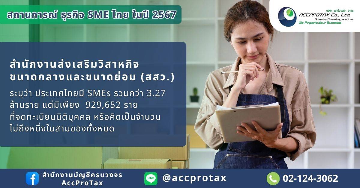 พิจารณาสถานการณ์ธุรกิจ SME ไทยในปี 2567 ข้อมูลจากสำนักงานส่งเสริมวิสาหกิจขนาดกลางและขนาดย่อม (สสว.) ระบุว่า ประเทศไทยมี SMEs รวมกว่า 3.27 ล้านราย แต่ มีเพียง 929652 รายที่เป็นจดทะเบียนนิติบุคคล หรือคิดเป็นไม่ถึงหนึ่งในสามของทั้งหมด โดยแยกเป็นภาคธุรกิจดังนี้ ภาคบริการ: 498523 ราย (ร้อยละ 53.6) ภาคการค้า: 305548 ราย (ร้อยละ 32.9) ภาคการผลิต: 115383 ราย (ร้อยละ 12.4) ภาคการเกษตร: 10198 ราย (ร้อยละ 1.1)