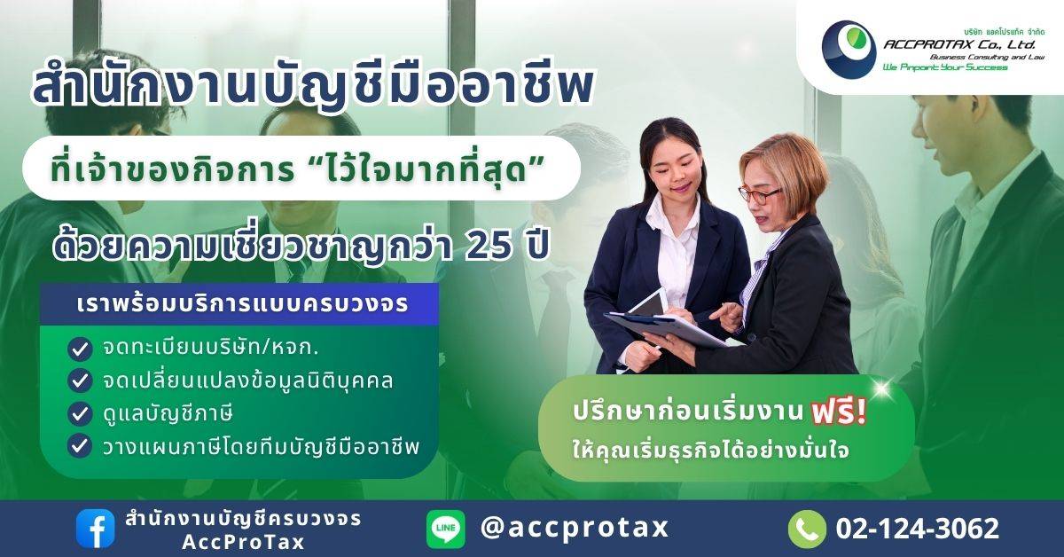 AccProTax เป็นสำนักงานบัญชีที่ให้บริการด้านบัญชี ยื่นภาษีประจำเดือน วางแผนภาษี และจดทะเบียนธุรกิจแบบครบวงจร ด้วยประสบการณ์ยาวนานกว่า 25 ปี ภายใต้แนวคิด “เข้าใจก่อนทำ” เพื่อให้ผู้ประกอบการสามารถวางแผนภาษีได้ถูกต้องตั้งแต่เริ่มต้นก้าวแรกของธุรกิจ ไปสู่ความสำเร็จอย่างมั่นคง ทีมงานประกอบด้วยนักบัญชี และที่ปรึกษาภาษีมืออาชีพ ที่มีประสบการณ์จริง พร้อมให้คำแนะนำฟรีก่อนเริ่มงาน และมีการรายงานผลประกอบการให้กิจการต่างๆ ทุกเดือน ดูแลอย่างใกล้ชิด เพื่อช่วยให้ธุรกิจของคุณเติบโตอย่างยั่งยืน มั่นคง และโปร่งใส สอบถามข้อมูลเพิ่มเติมได้ที่ เว็บไซต์: www.accprotax.com หมายเลขโทรศัพท์: 02 124 3062 หรือ Line Official: @accprotax
