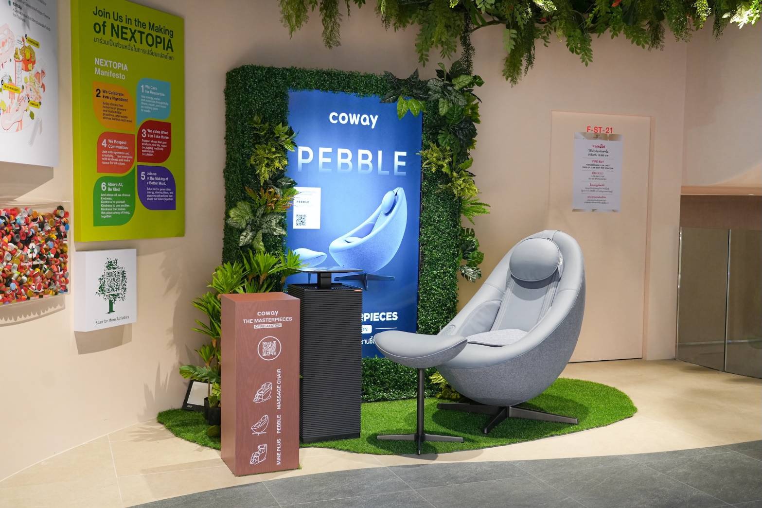 ภายในโซน The Master of Relaxation โคเวย์จัดโชว์ไลน์อัปใหม่เก้าอี้นวดไฟฟ้ารุ่น Pebble และเครื่องฟอกอากาศพรีเมียมรุ่น Noble2 ที่ผสานเทคโนโลยีขั้นสูงเข้ากับดีไซน์ที่กลมกลืนทุกสไตล์การแต่งบ้าน ต่อเนื่องด้วยโซน Revolutionary ที่จัดแสดงเครื่องกรองน้ำรุ่น CORE ซึ่งออกแบบอย่างพิถีพิถันเพื่อตอบรับไลฟ์สไตล์ยุคใหม่ พร้อมจุดบริการเครื่องกรองน้ำแบบอินเตอร์แอ็กทีฟ 4 จุด ให้ผู้เข้าชมได้ลิ้มรสน้ำดื่มคุณภาพและสัมผัสระบบฟอกอากาศอัจฉริยะของโคเวย์อย่างเต็มรูปแบบ เติมเต็มประสบการณ์ด้านสุขภาพให้ครบถ้วนสมบูรณ์